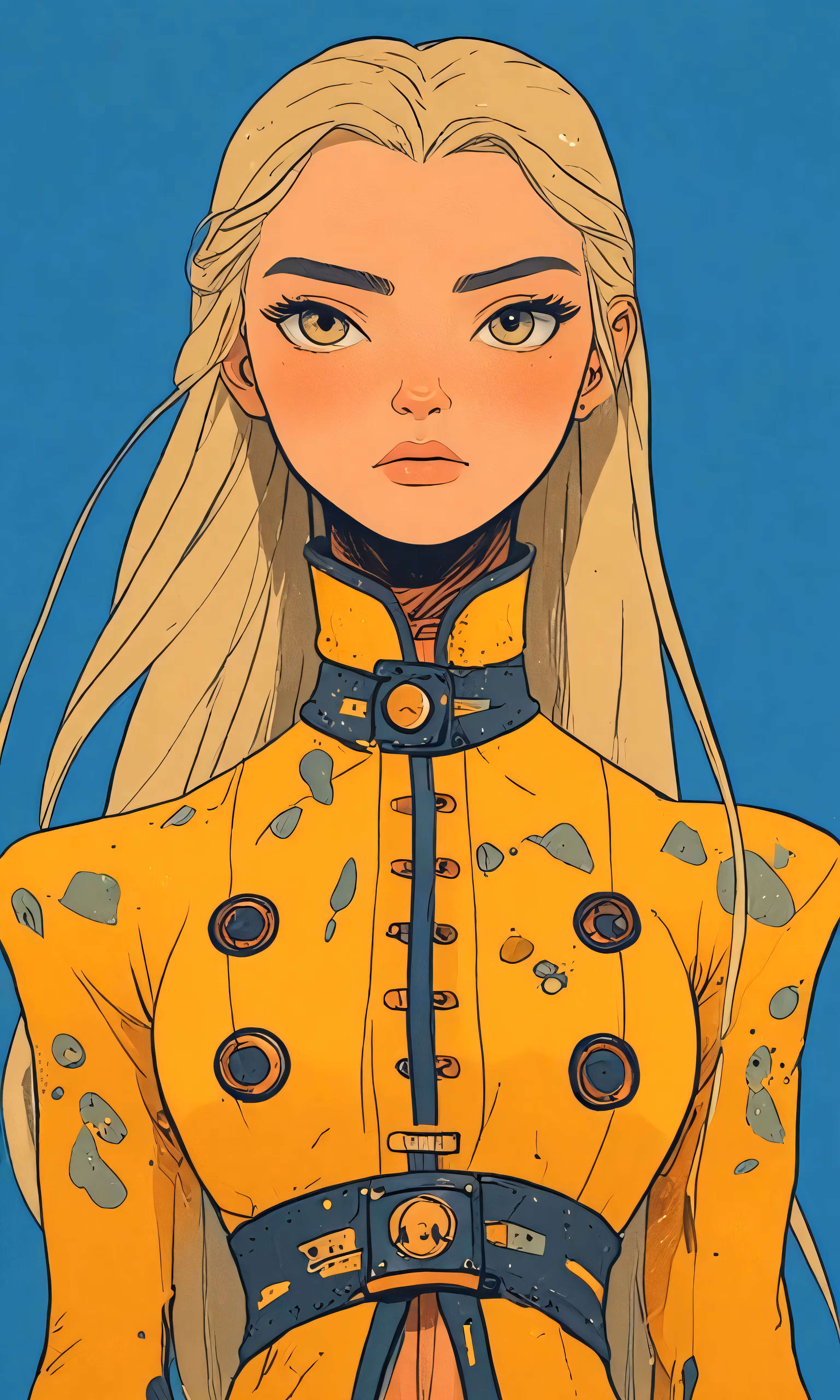 High resolution picture, free to use, a drawing of a person with blonde hair and blue eyes
