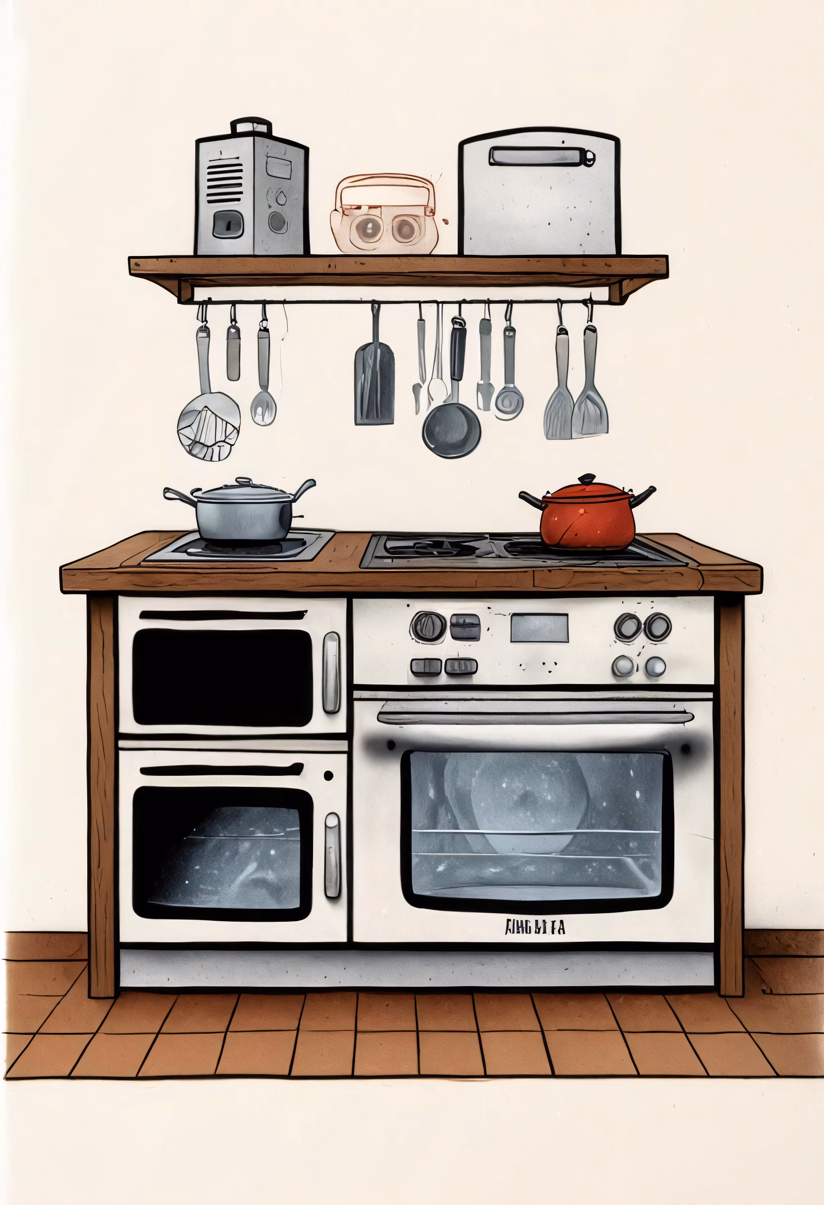 High resolution picture, free to use, a drawing of a stove with utensils hanging on the rack above