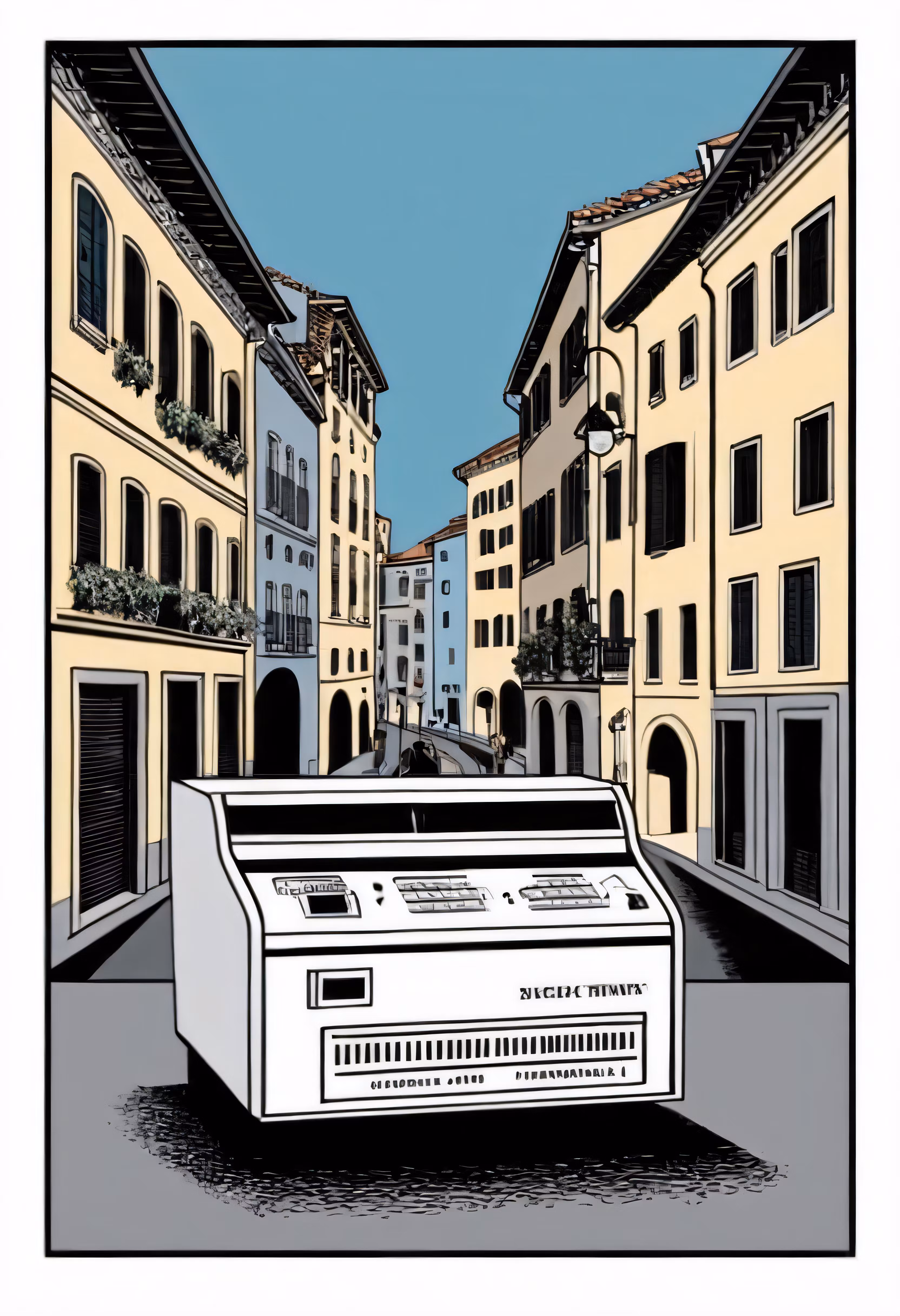 High resolution picture, free to use, a drawing of a white stereo cassette player in the street