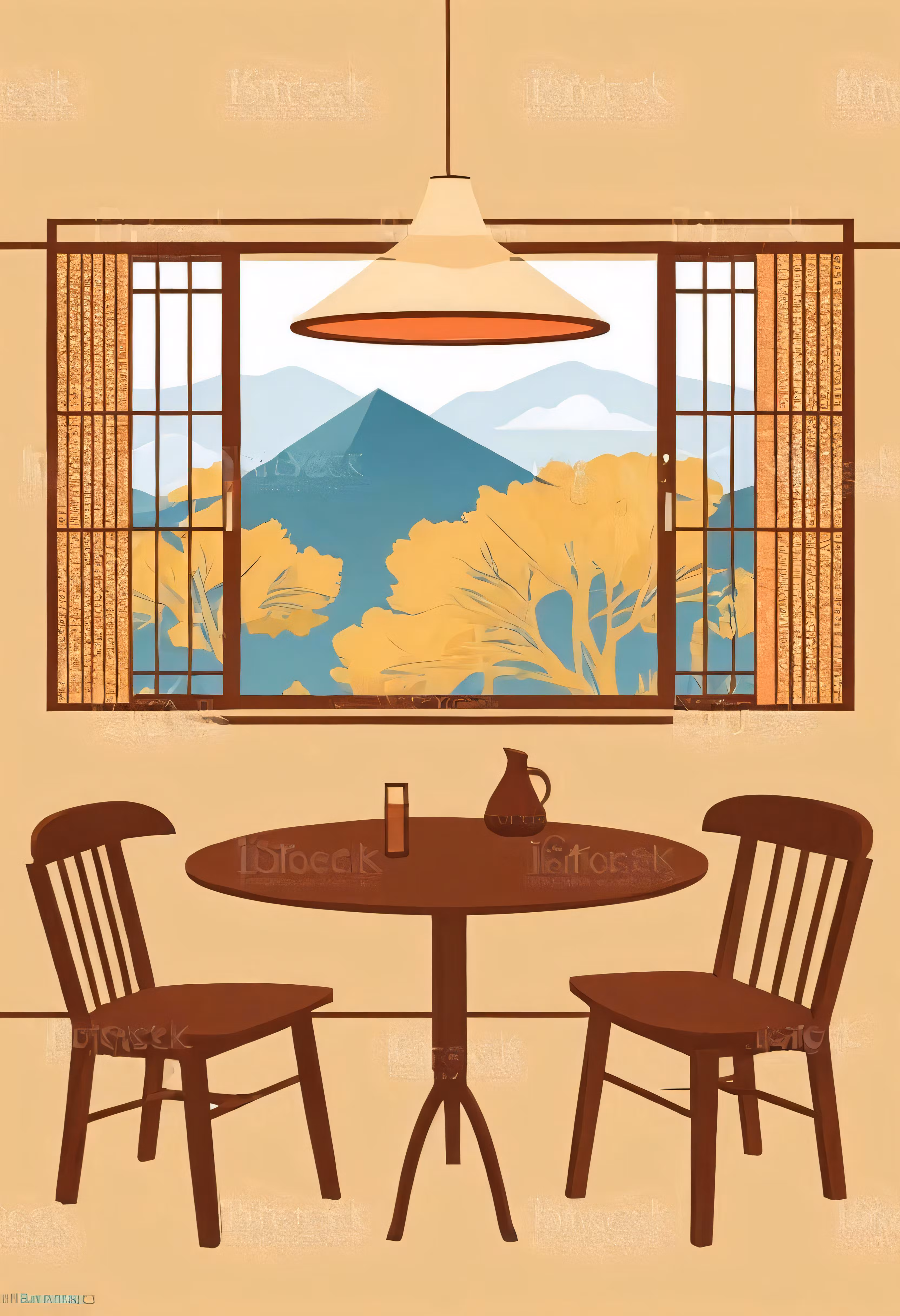 High resolution picture, free to use, a drawing of a window looking out over a table with two chairs in the room