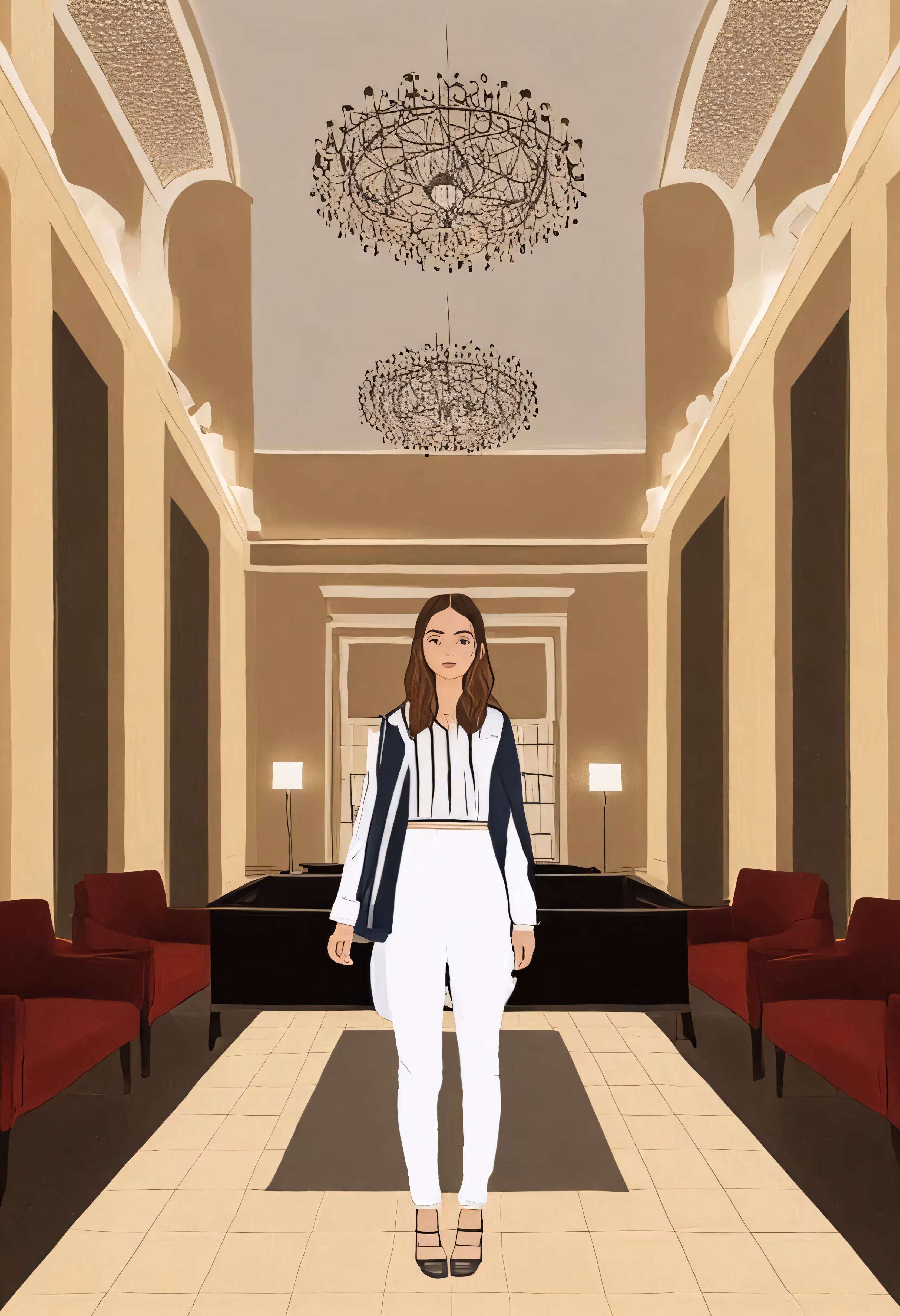 High resolution picture, free to use, a drawing of a woman walking in a hallway