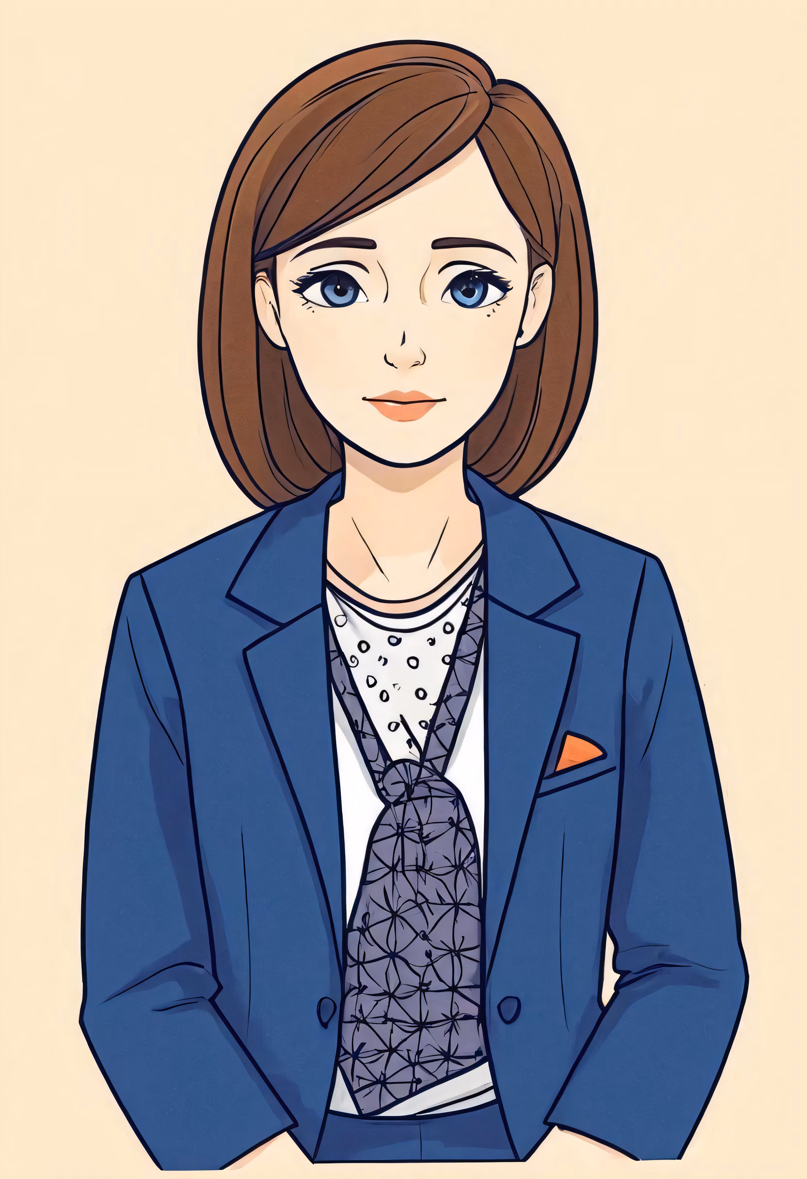 High resolution picture, free to use, a drawing of a woman wearing a blue jacket