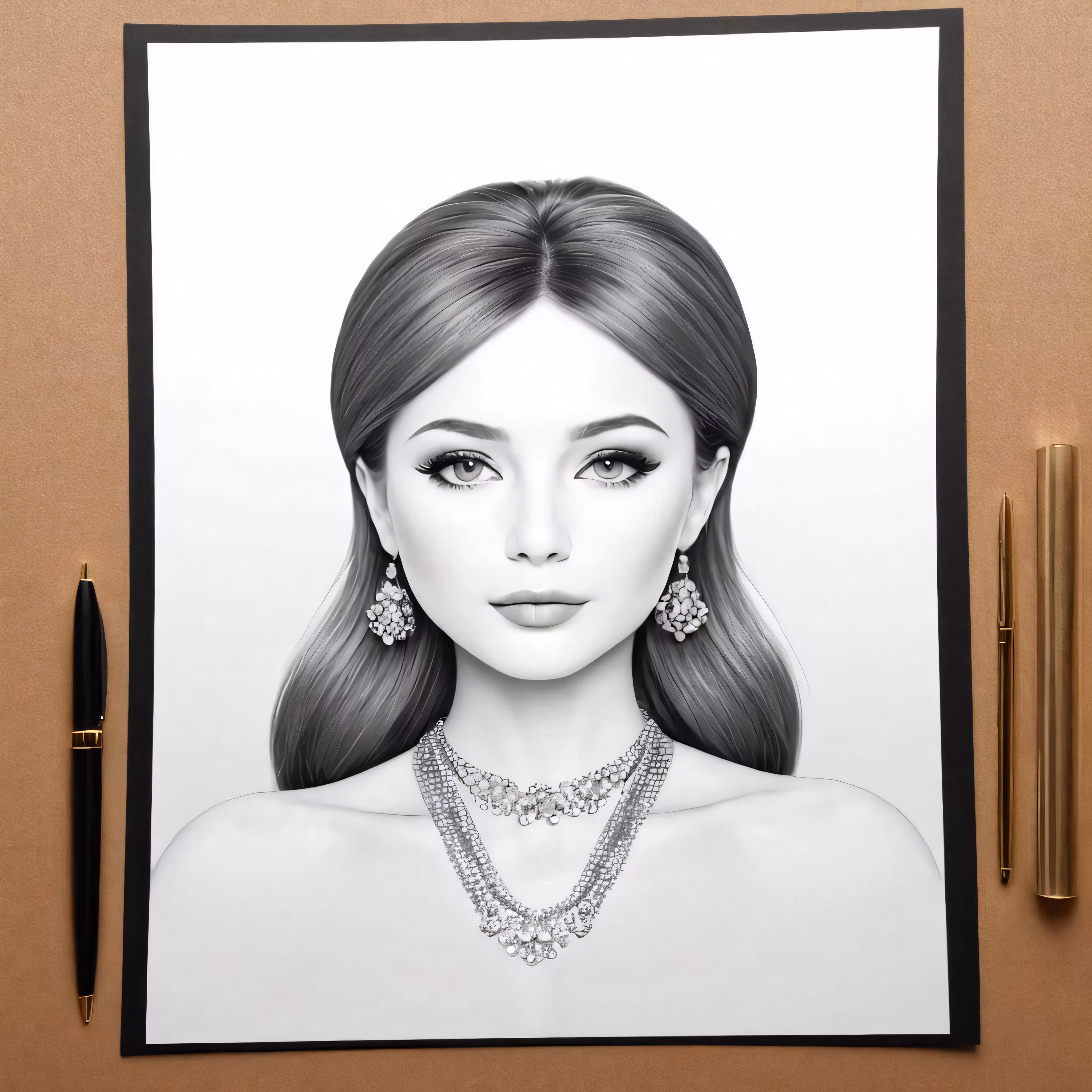 High resolution picture, free to use, a drawing of a woman with a necklace and earrings