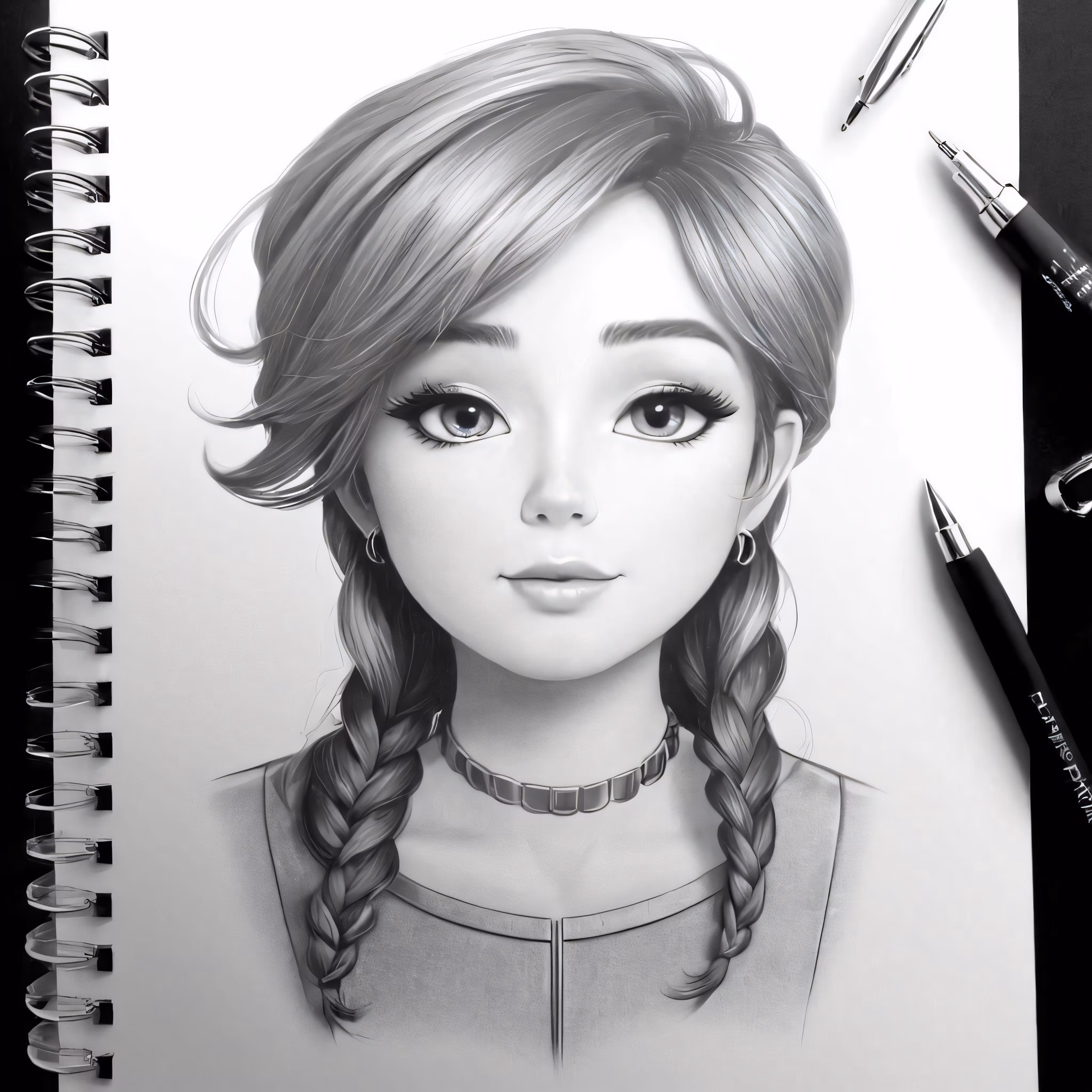 High resolution picture, free to use, a drawing of a woman with braids on her hair
