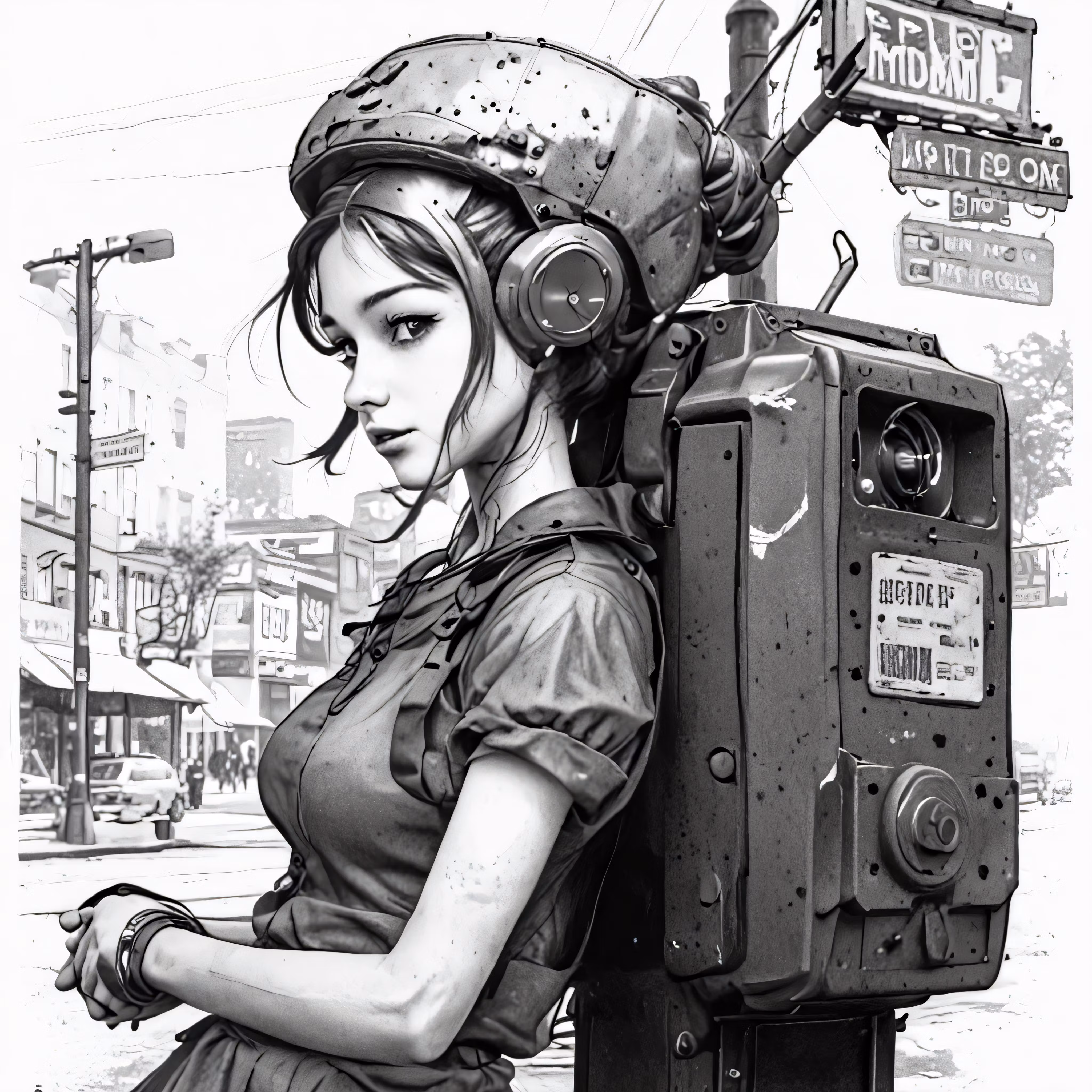 High resolution picture, free to use, a drawing of a woman with ear phones leaning on a camera