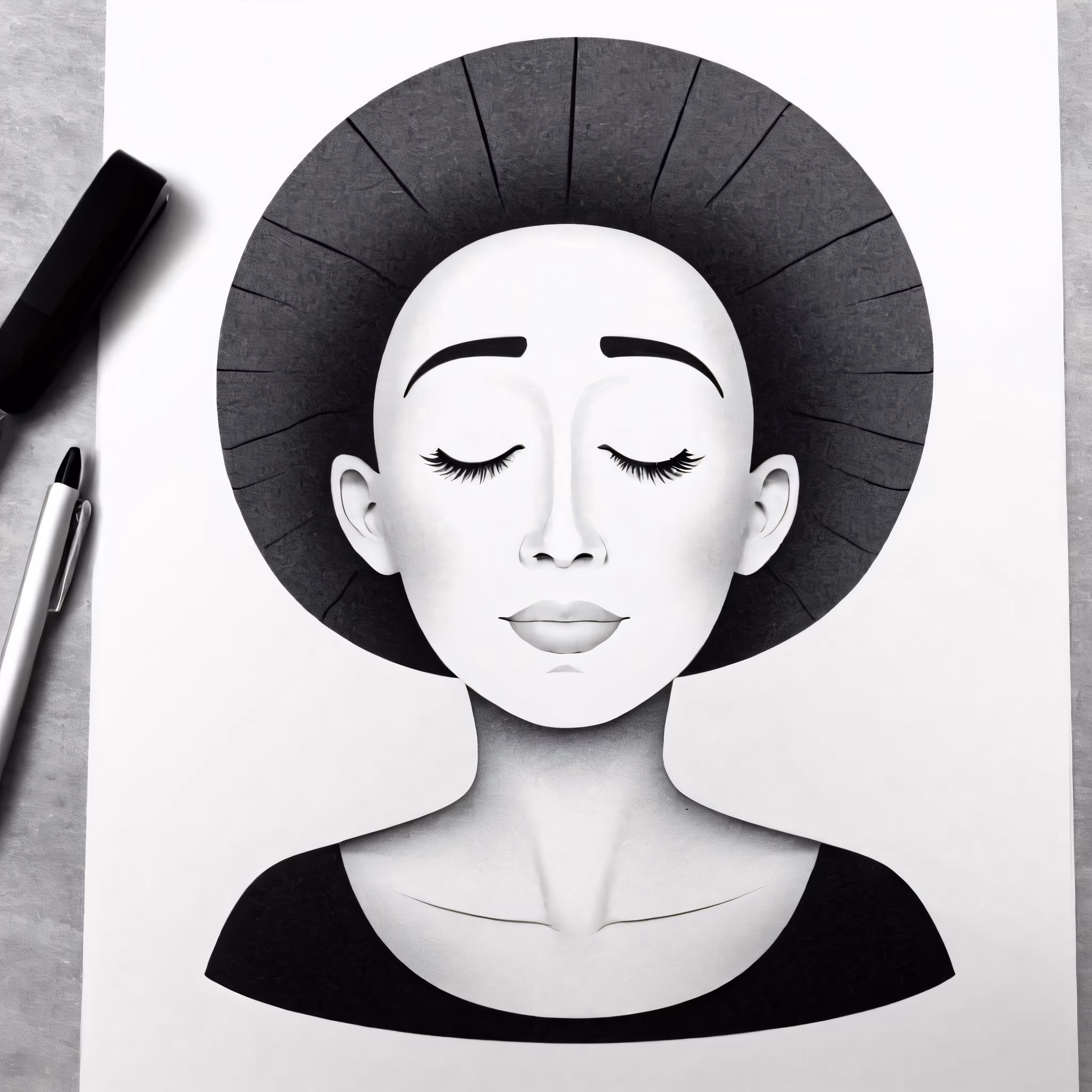 High resolution picture, free to use, a drawing of a woman with eyes closed and head tilted, as if in an art book or paper