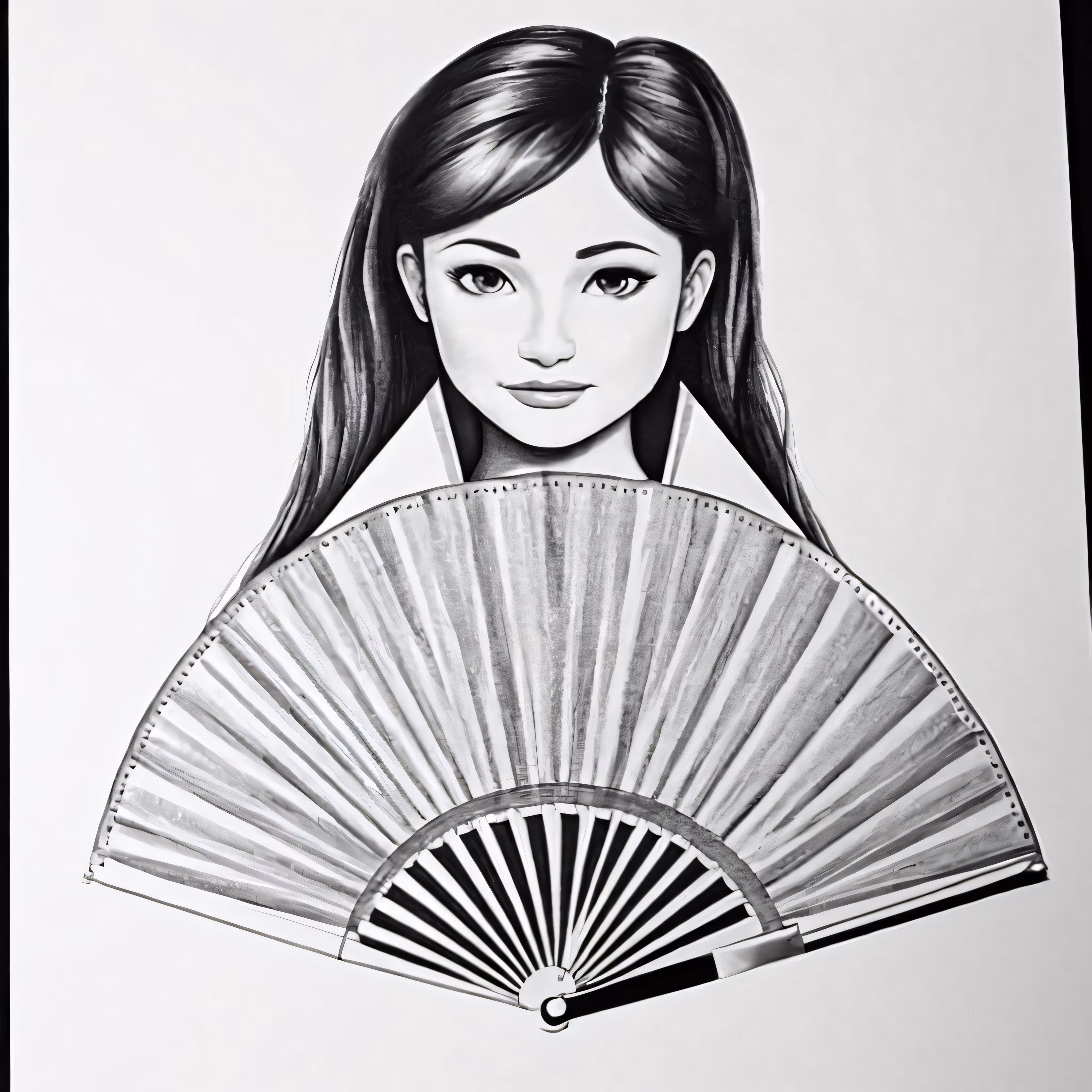 High resolution picture, free to use, a drawing of a woman with long hair holding an elaborate fan