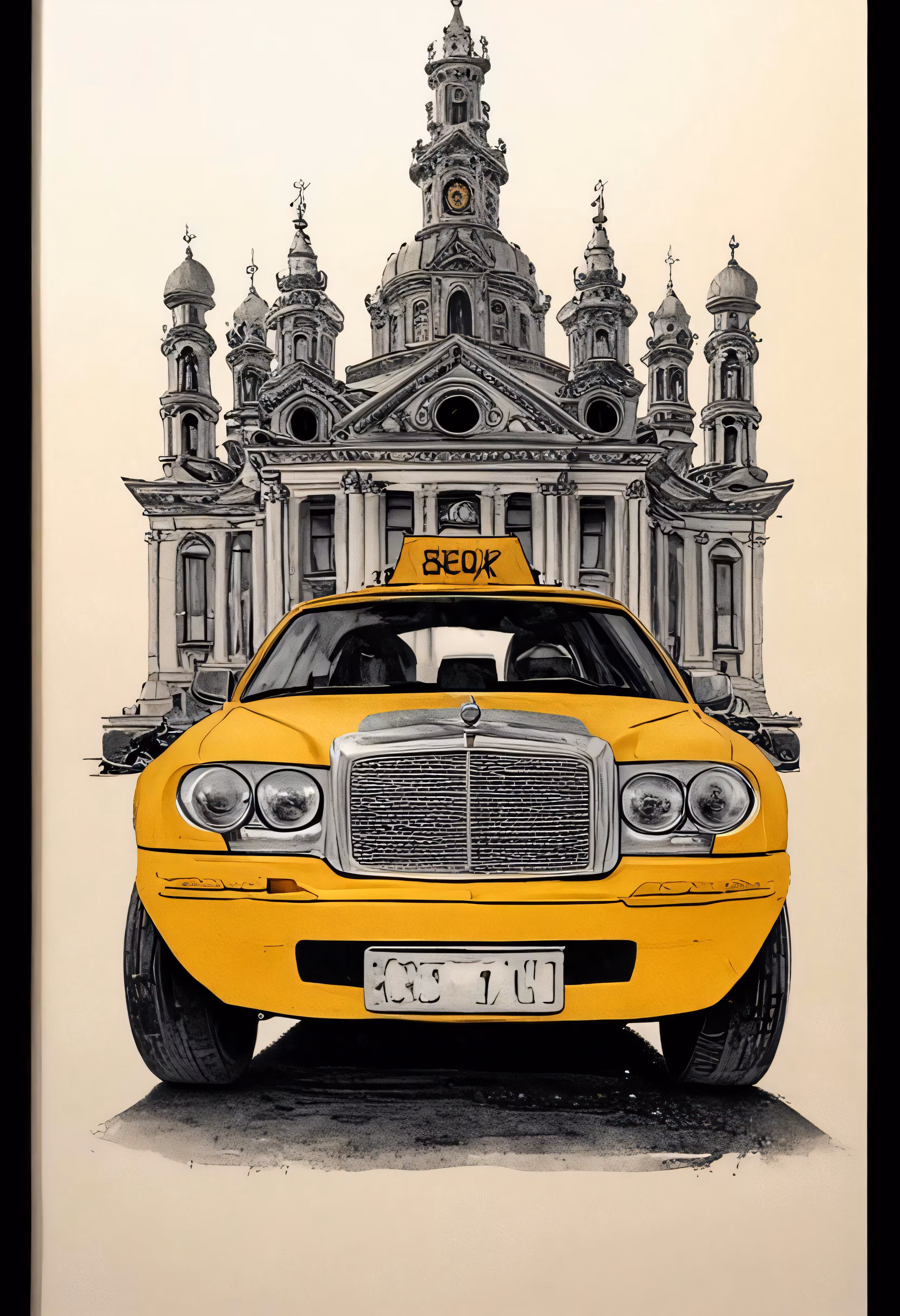 High resolution picture, free to use, a drawing of a yellow taxi with an old church in the background