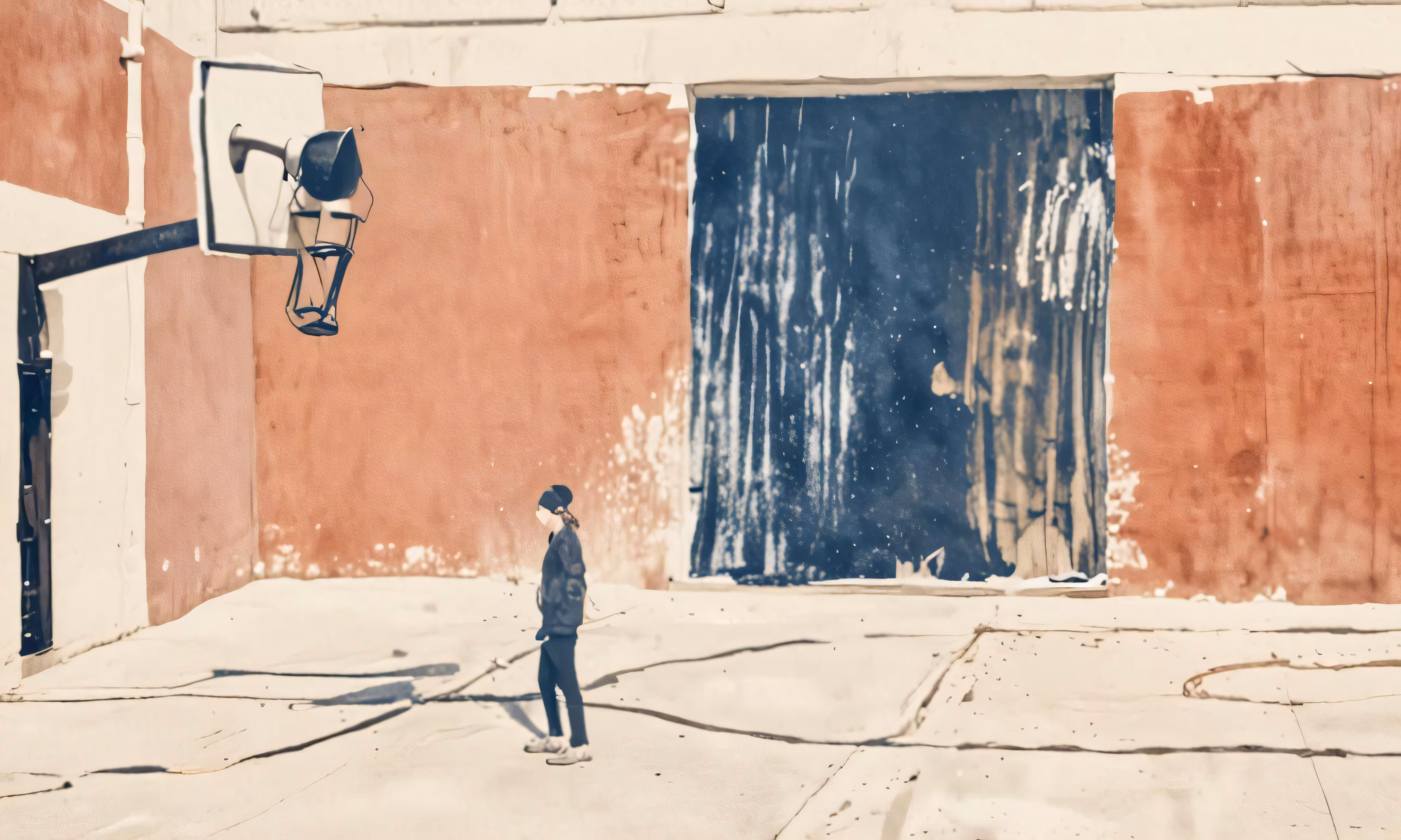 High resolution picture, free to use, a drawing of a young child walking down an alley way