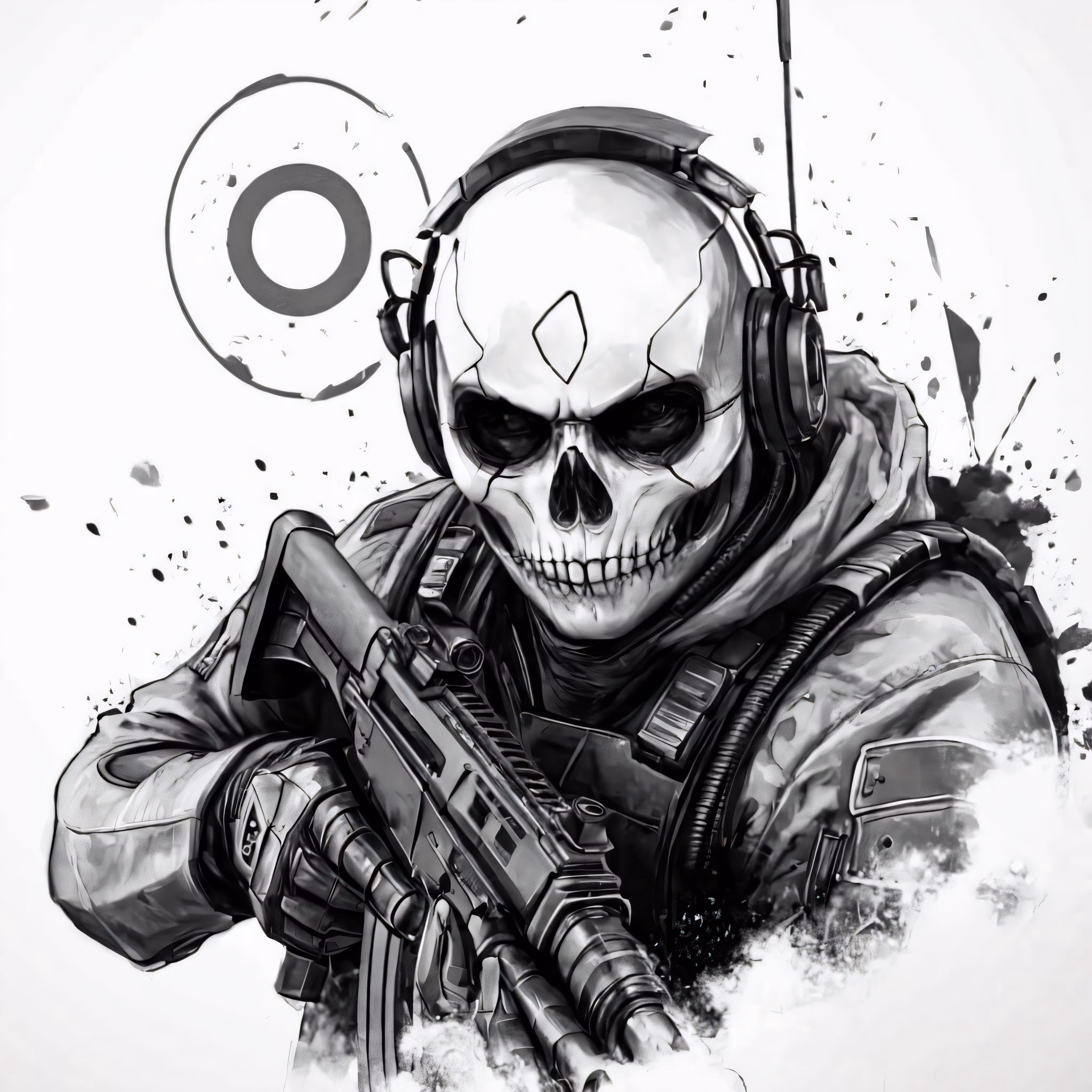 High resolution picture, free to use, a drawing of an action skeleton with headphones and rifle