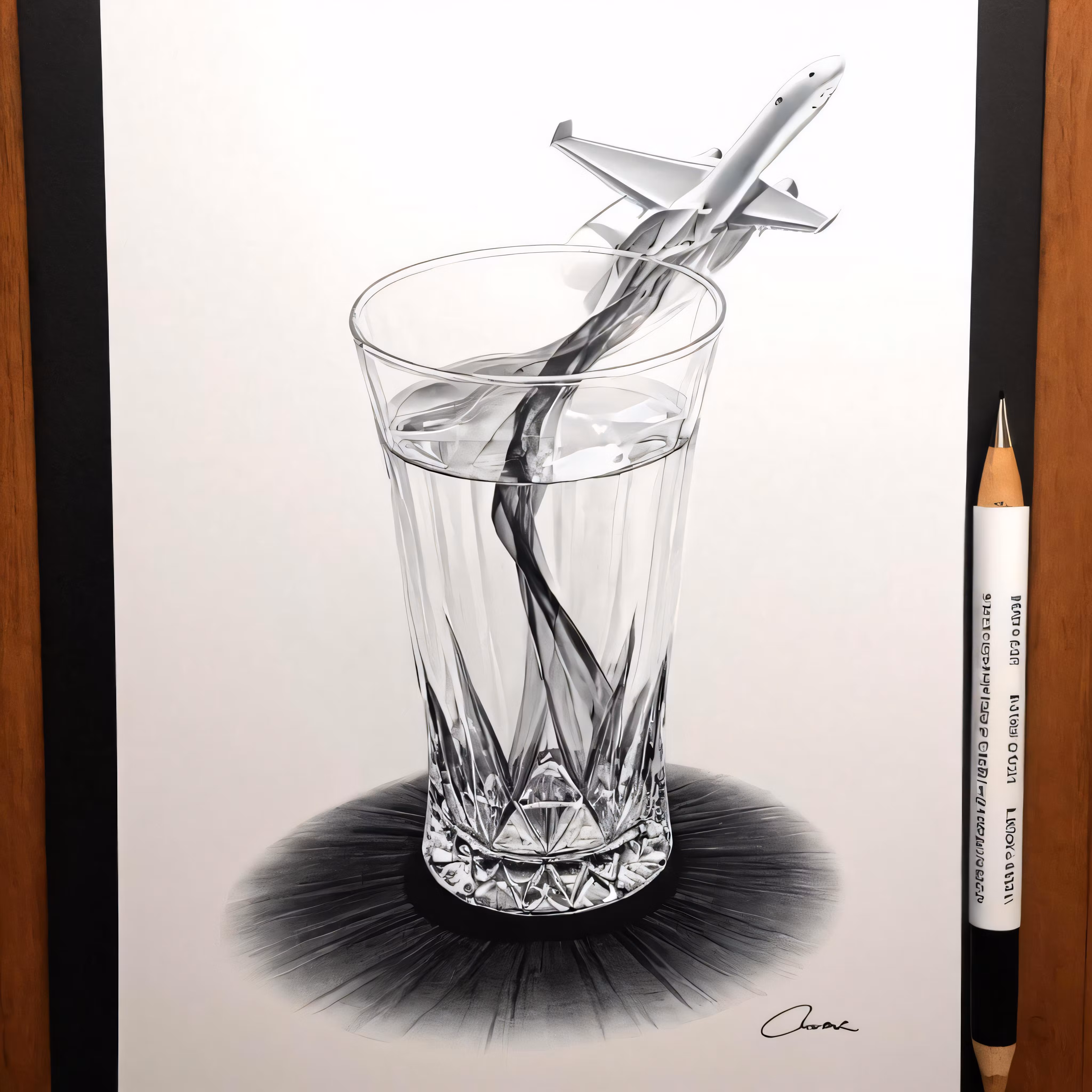 High resolution picture, free to use, a drawing of an airplane coming out of a glass