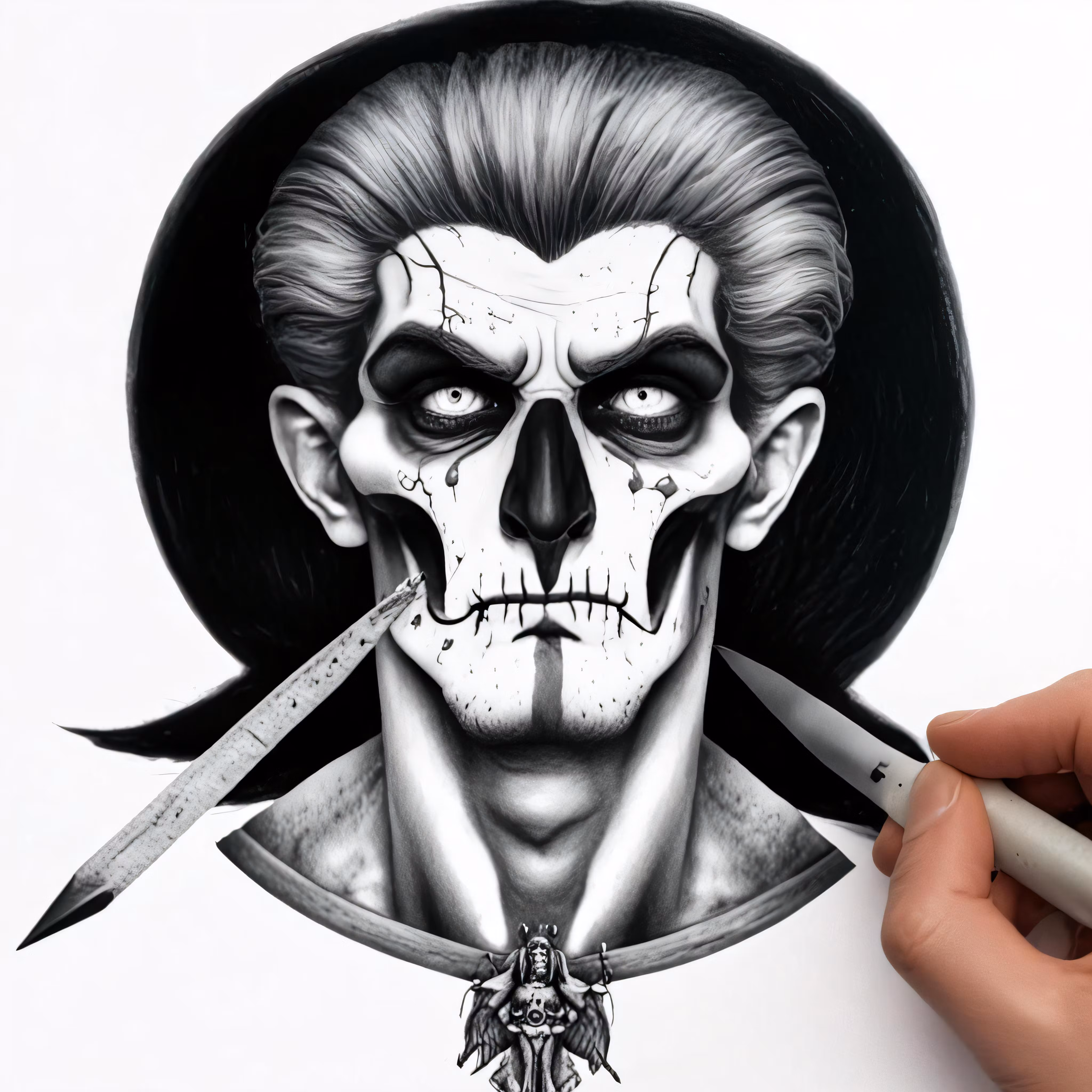 High resolution picture, free to use, a drawing of an evil looking skeleton holding a knife