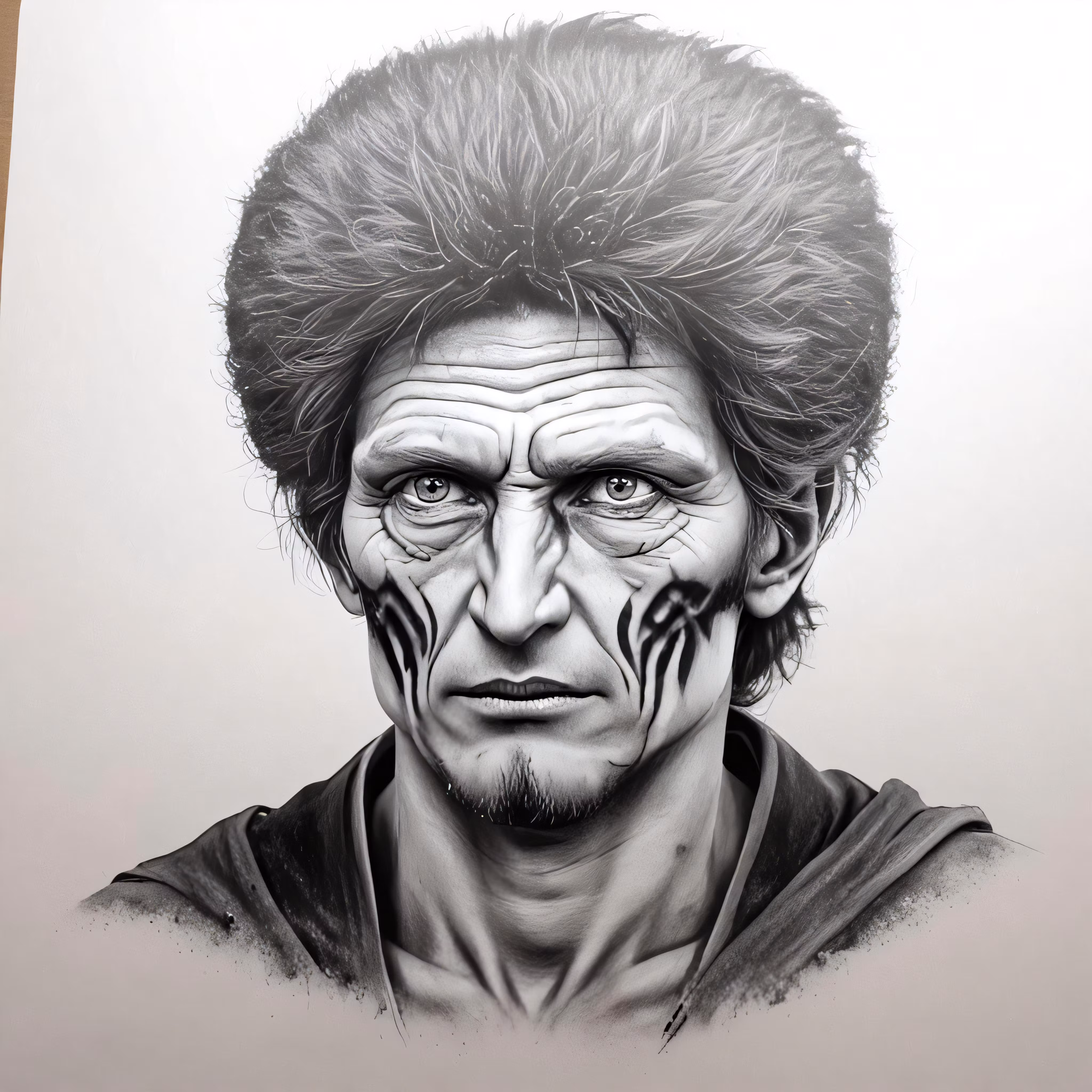 High resolution picture, free to use, a drawing of an evil man looking into the distance