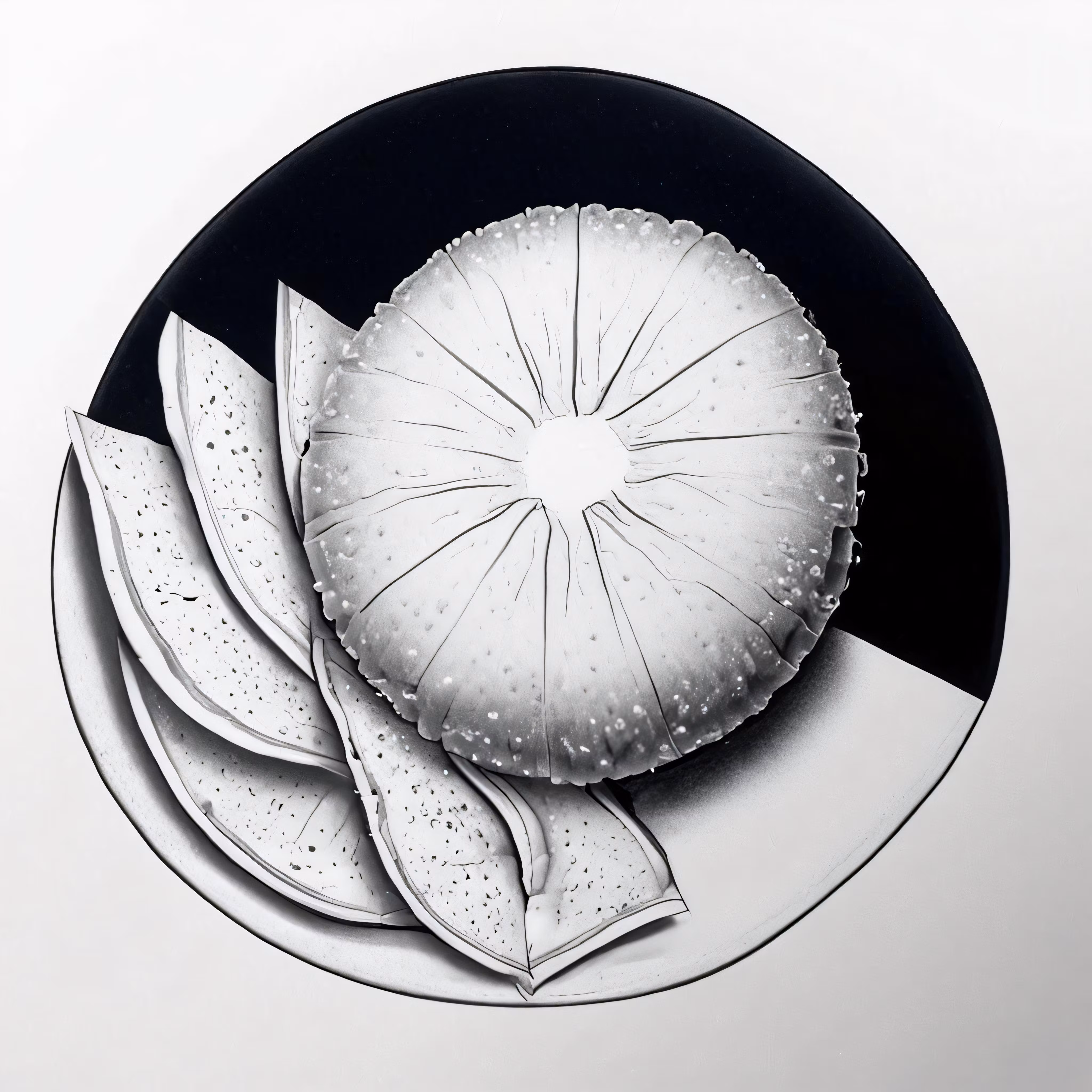 High resolution picture, free to use, a drawing of an orange slice sitting on top of a white plate