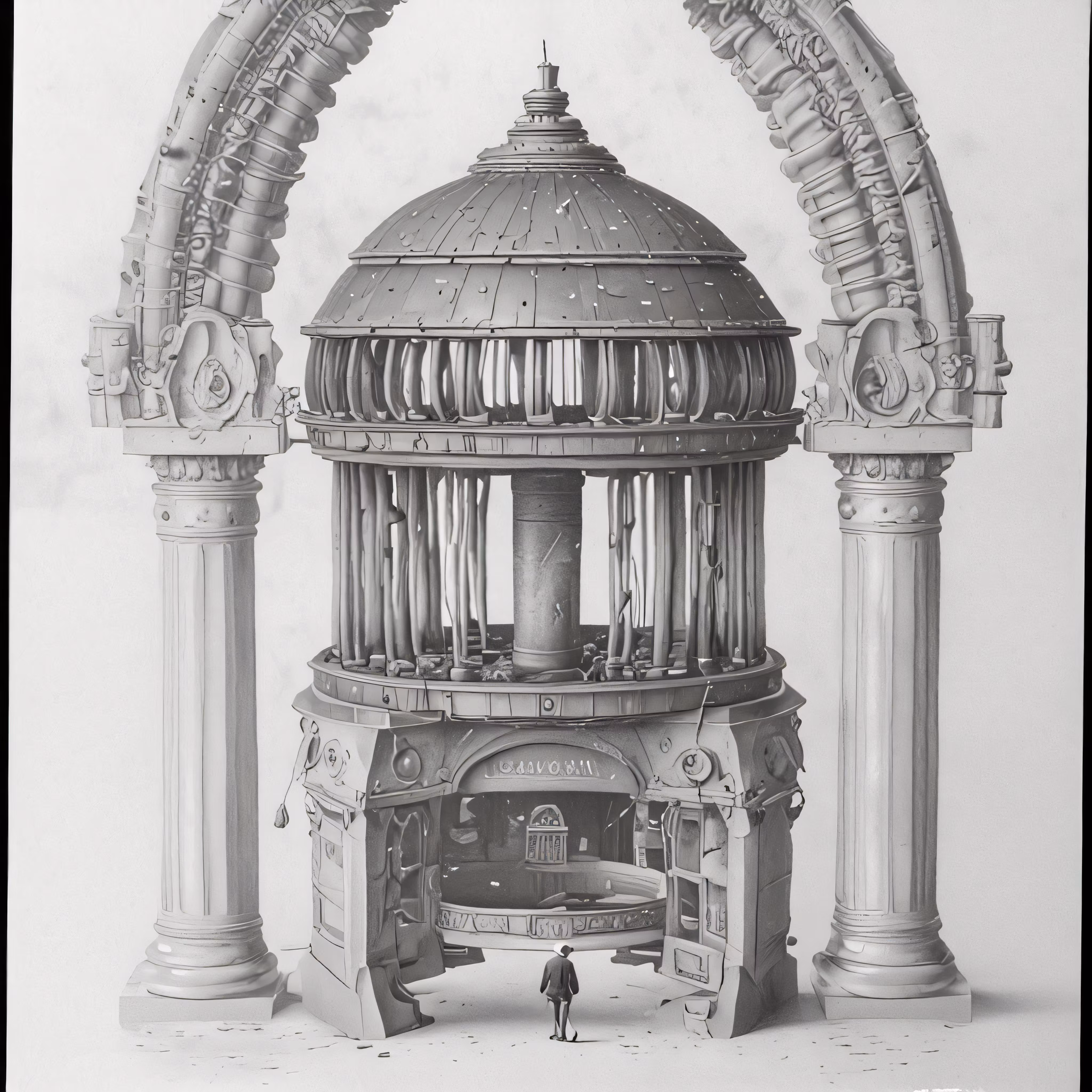 High resolution picture, free to use, a drawing of an ornate structure in a museum
