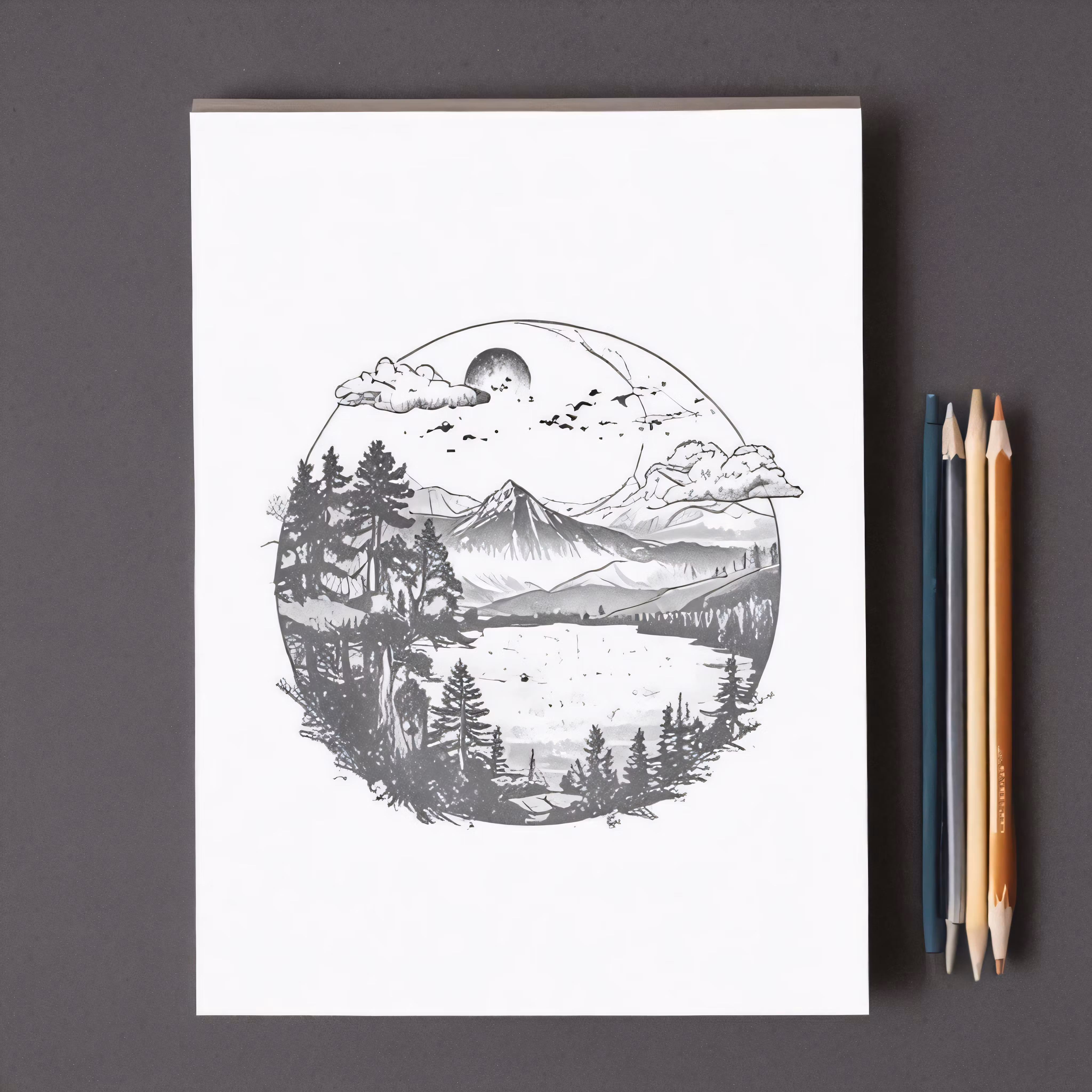 High resolution picture, free to use, a drawing of mountains and trees is on top of a table