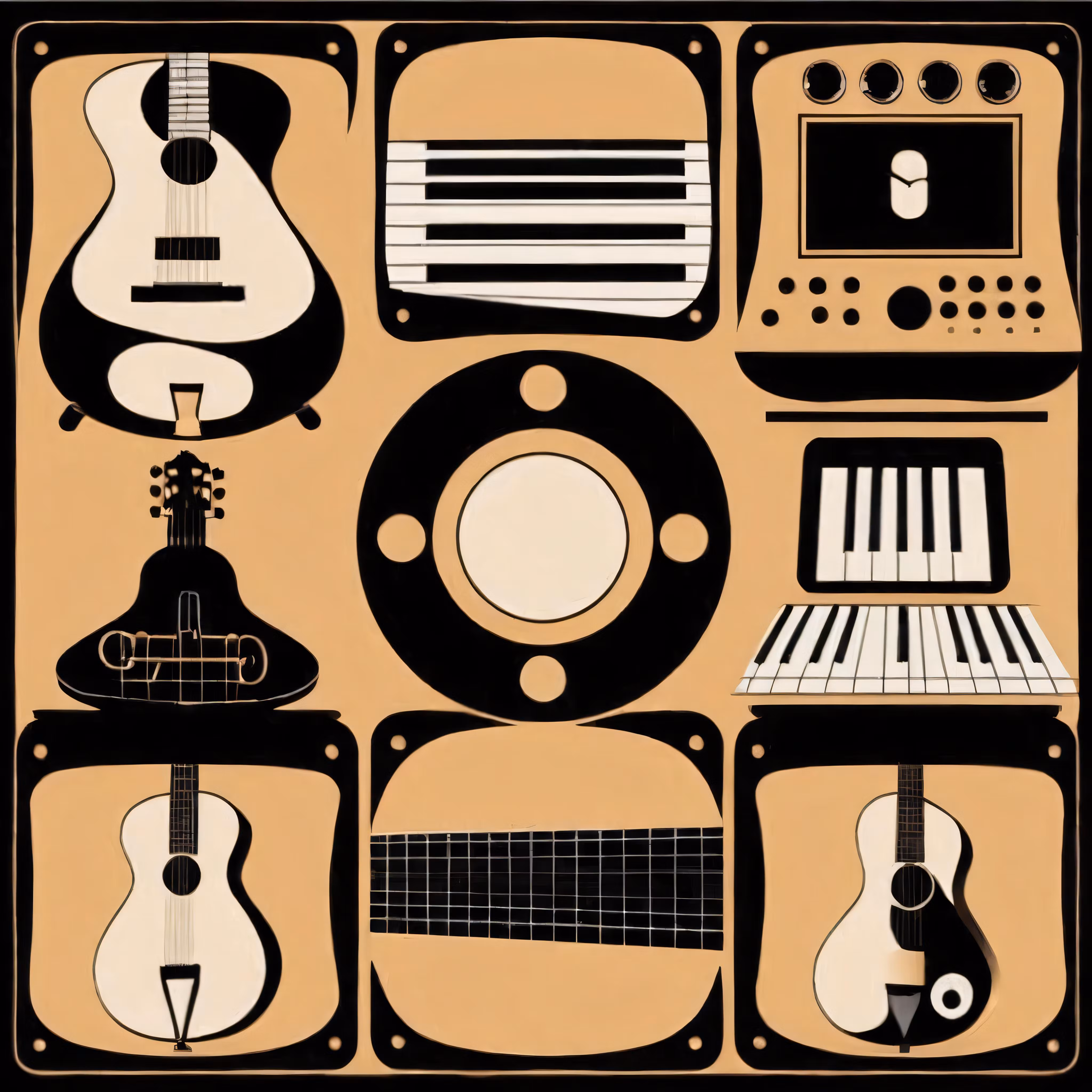 High resolution picture, free to use, a drawing of musical instruments on a wooden table