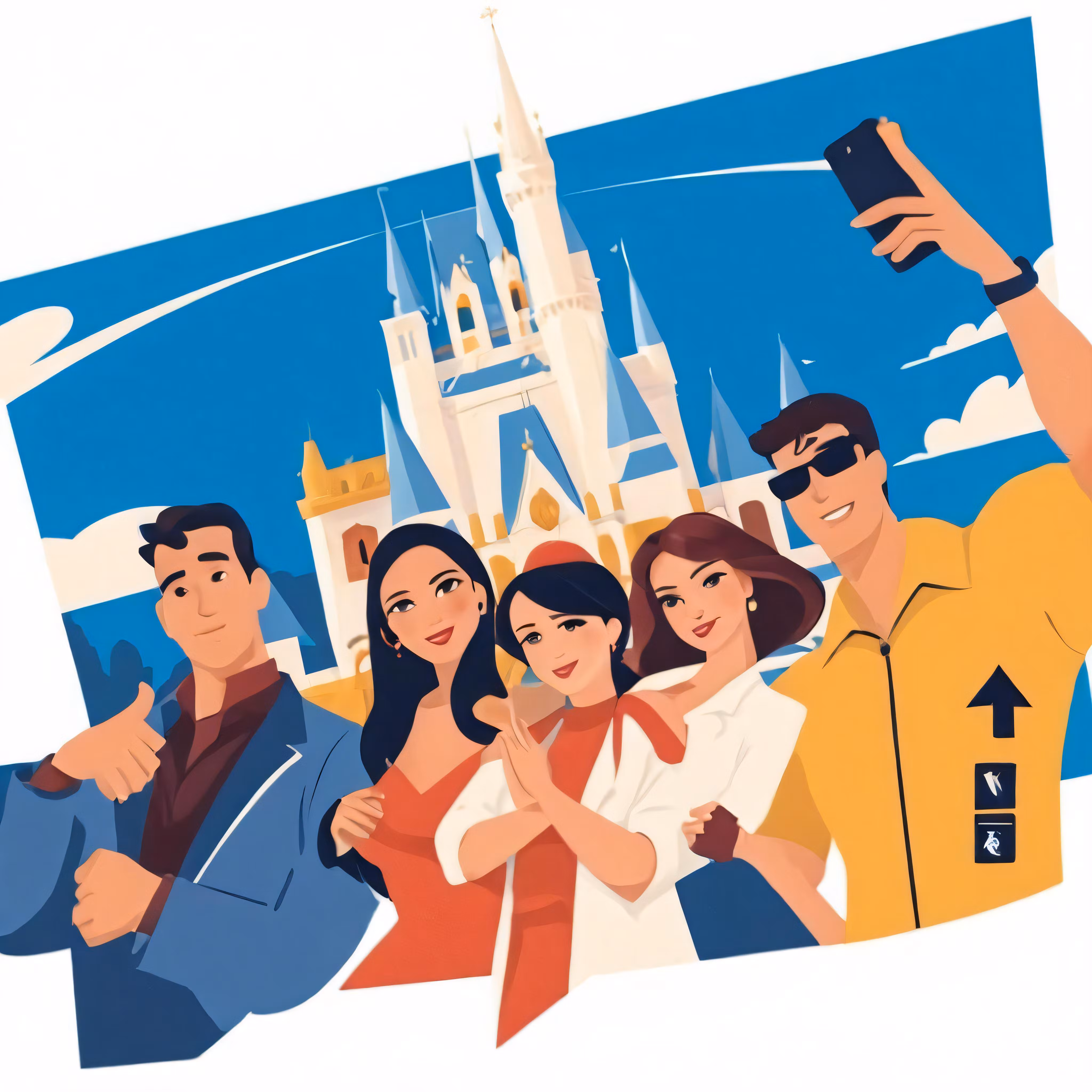 High resolution picture, free to use, a drawing of people holding up a cell phone in front of a castle