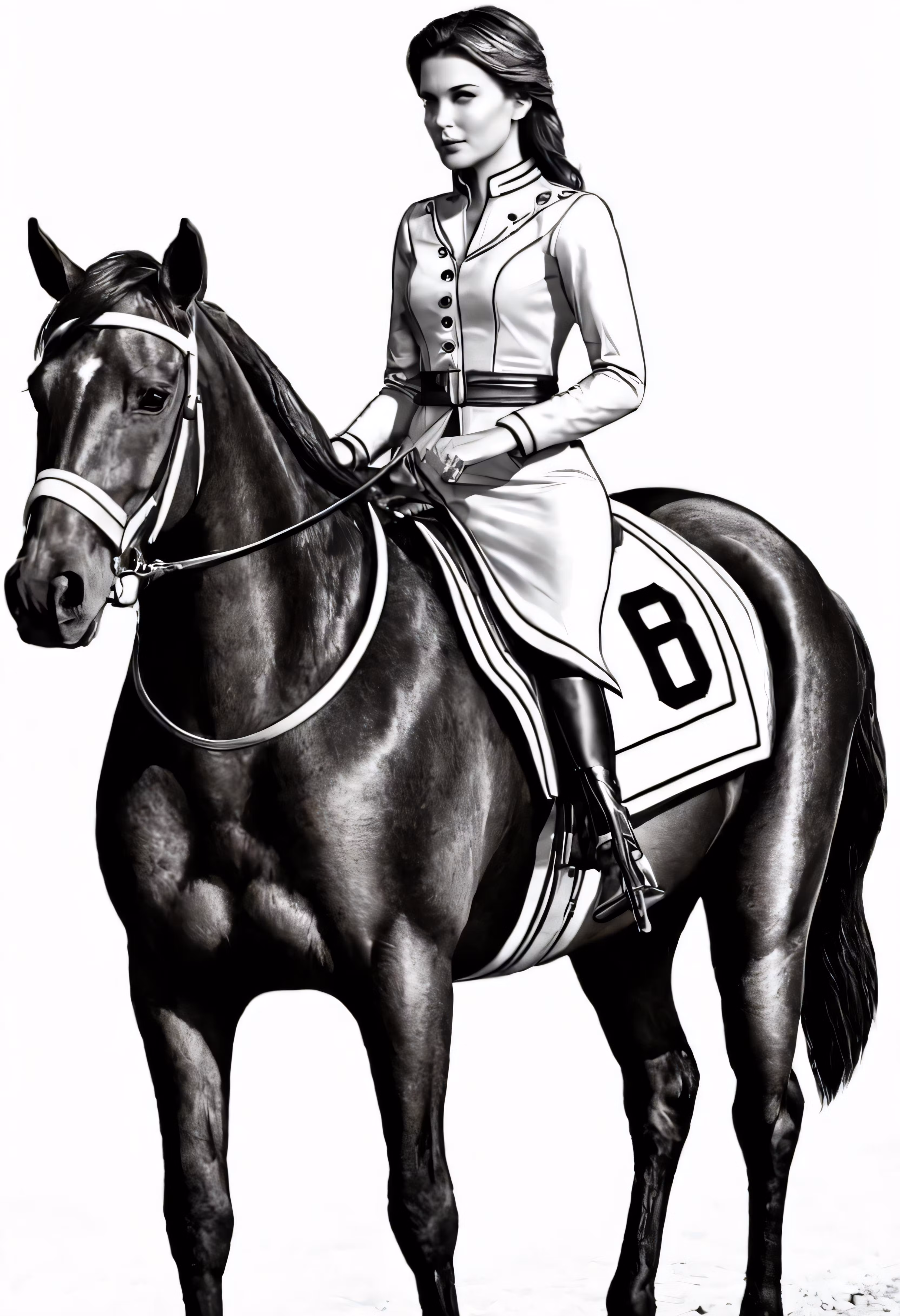 High resolution picture, free to use, a drawing of the horse and rider is in black and white