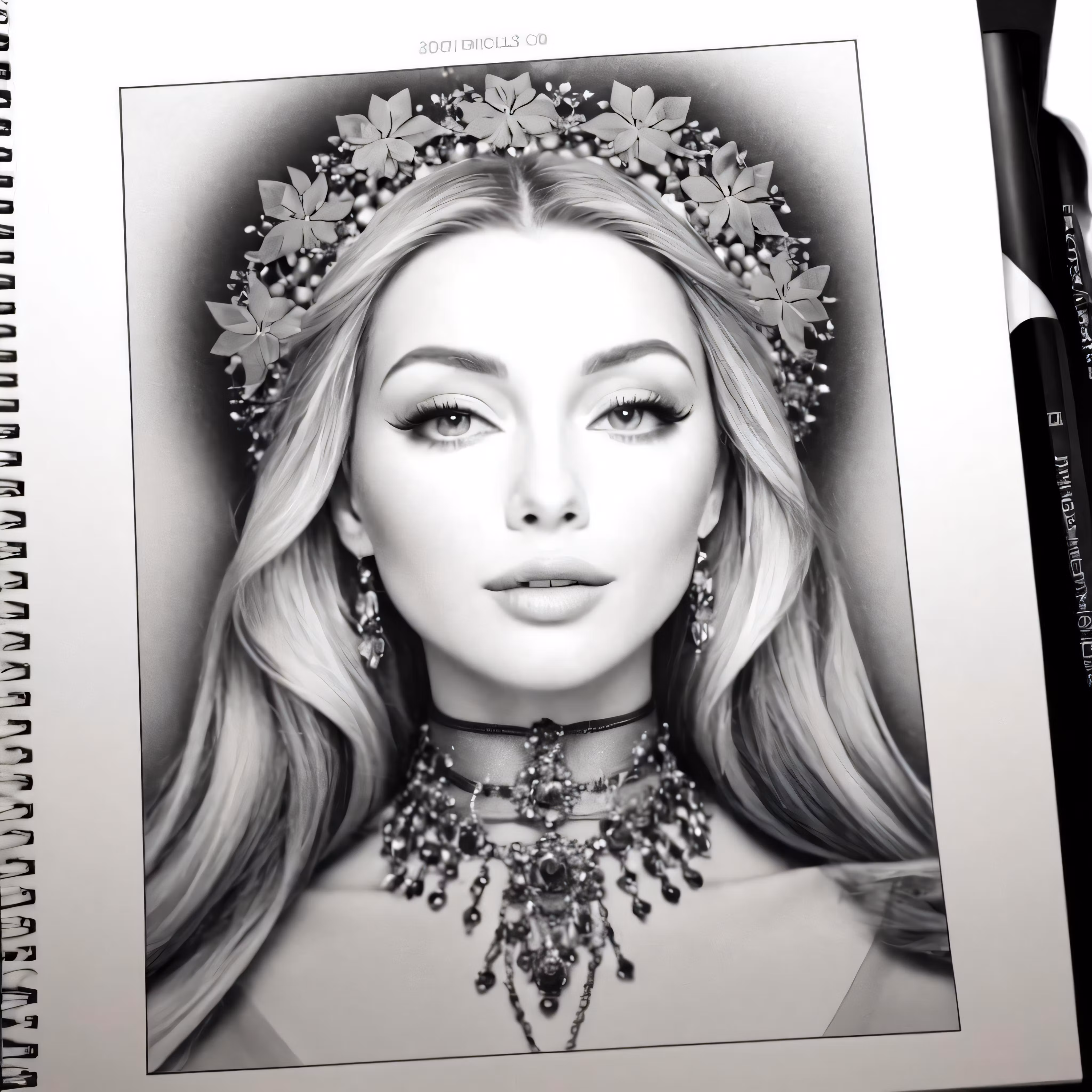 High resolution picture, free to use, a drawing of the model wearing jewelry and pearls
