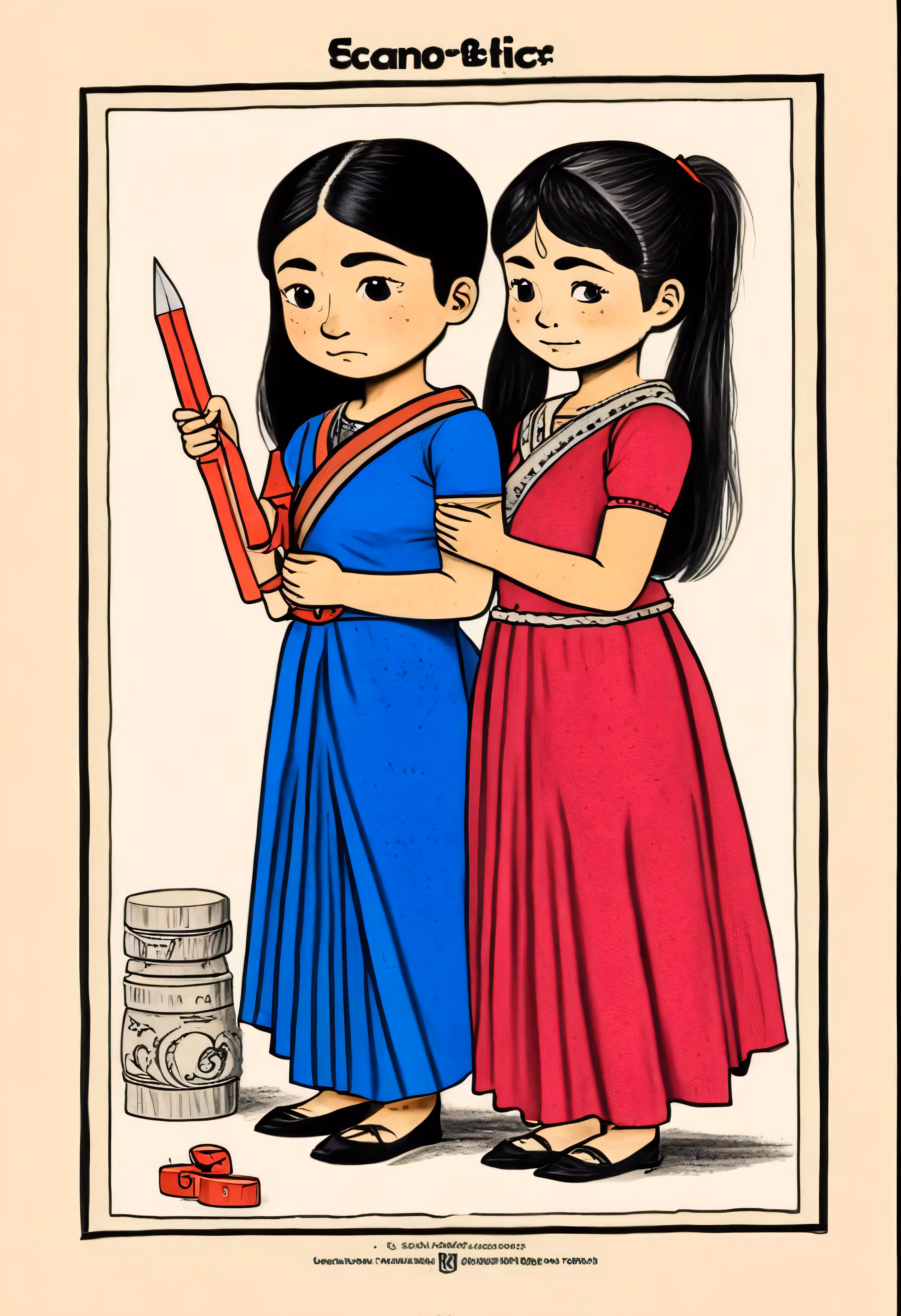 High resolution picture, free to use, a drawing of two young girls standing together holding a knife