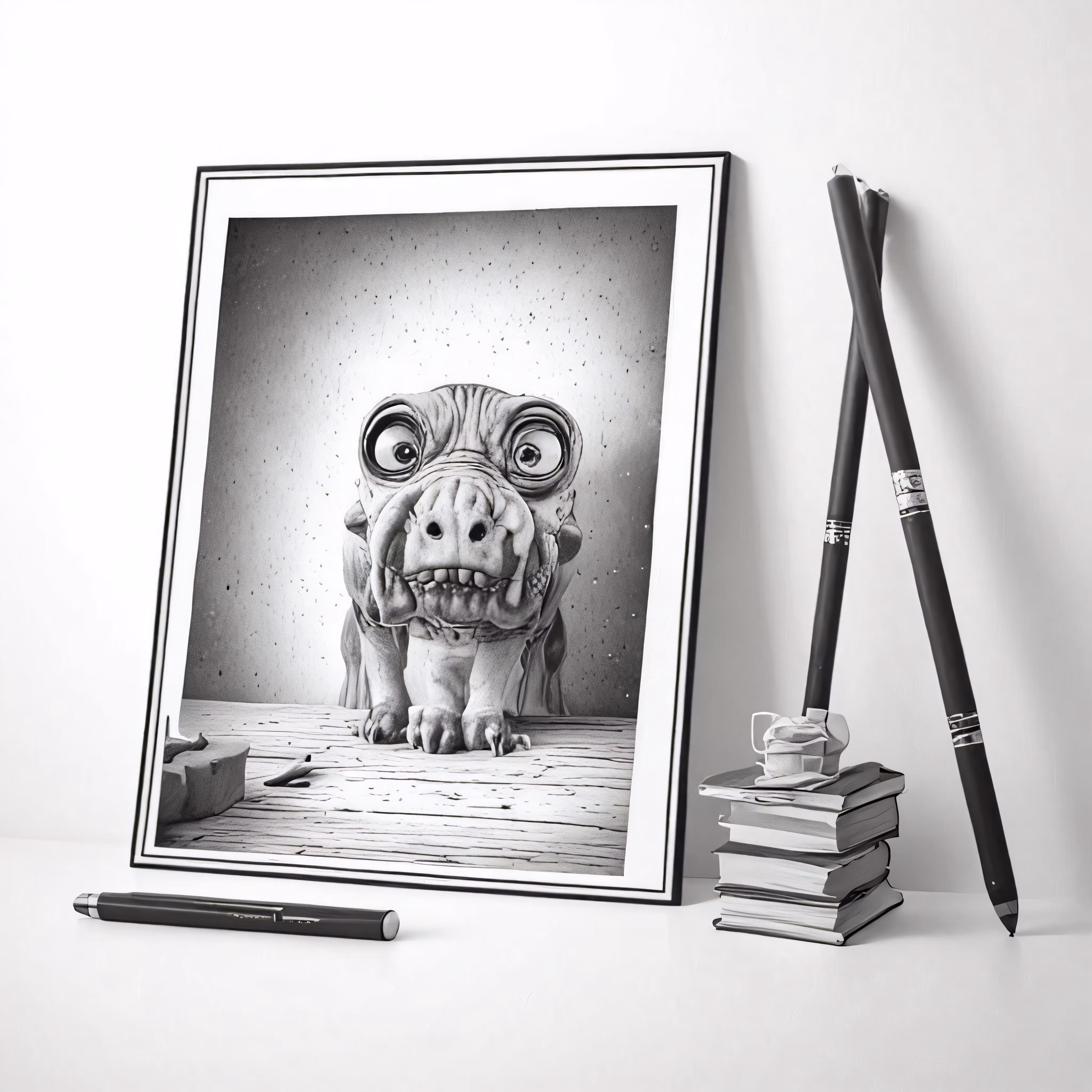 High resolution picture, free to use, a drawing on top of a stack of books next to two pencils