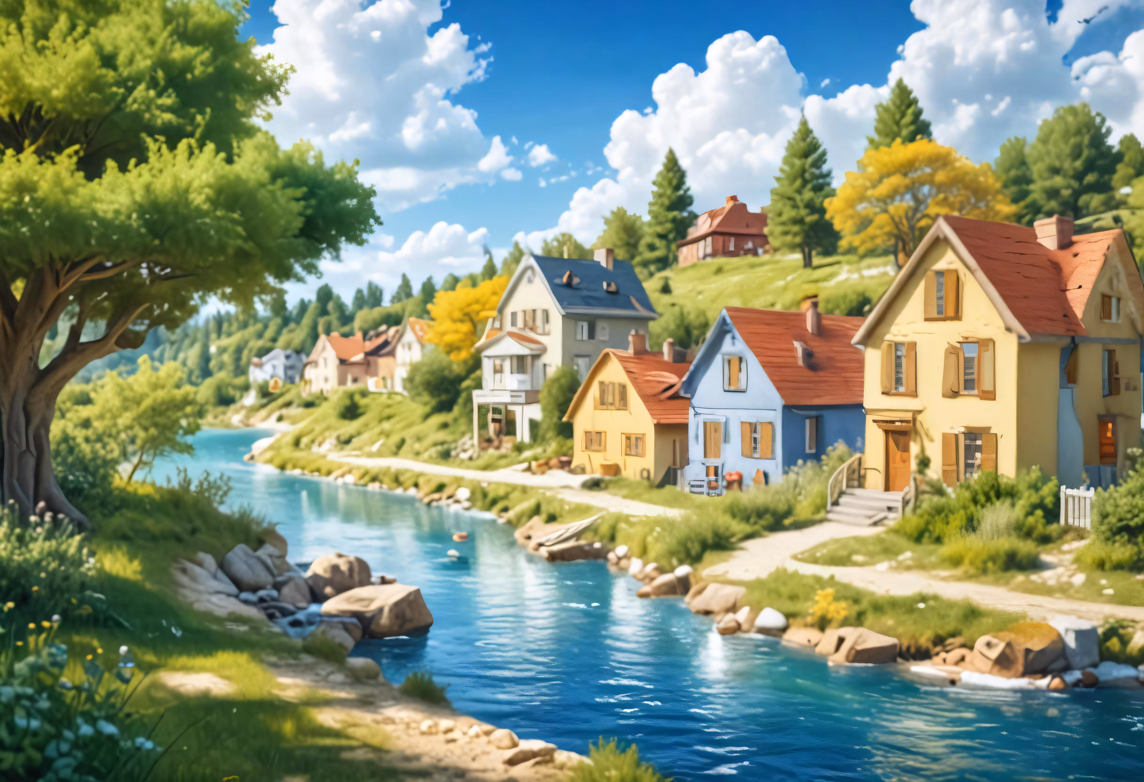 High resolution picture, free to use, a drawing shows a bunch of small houses near the river
