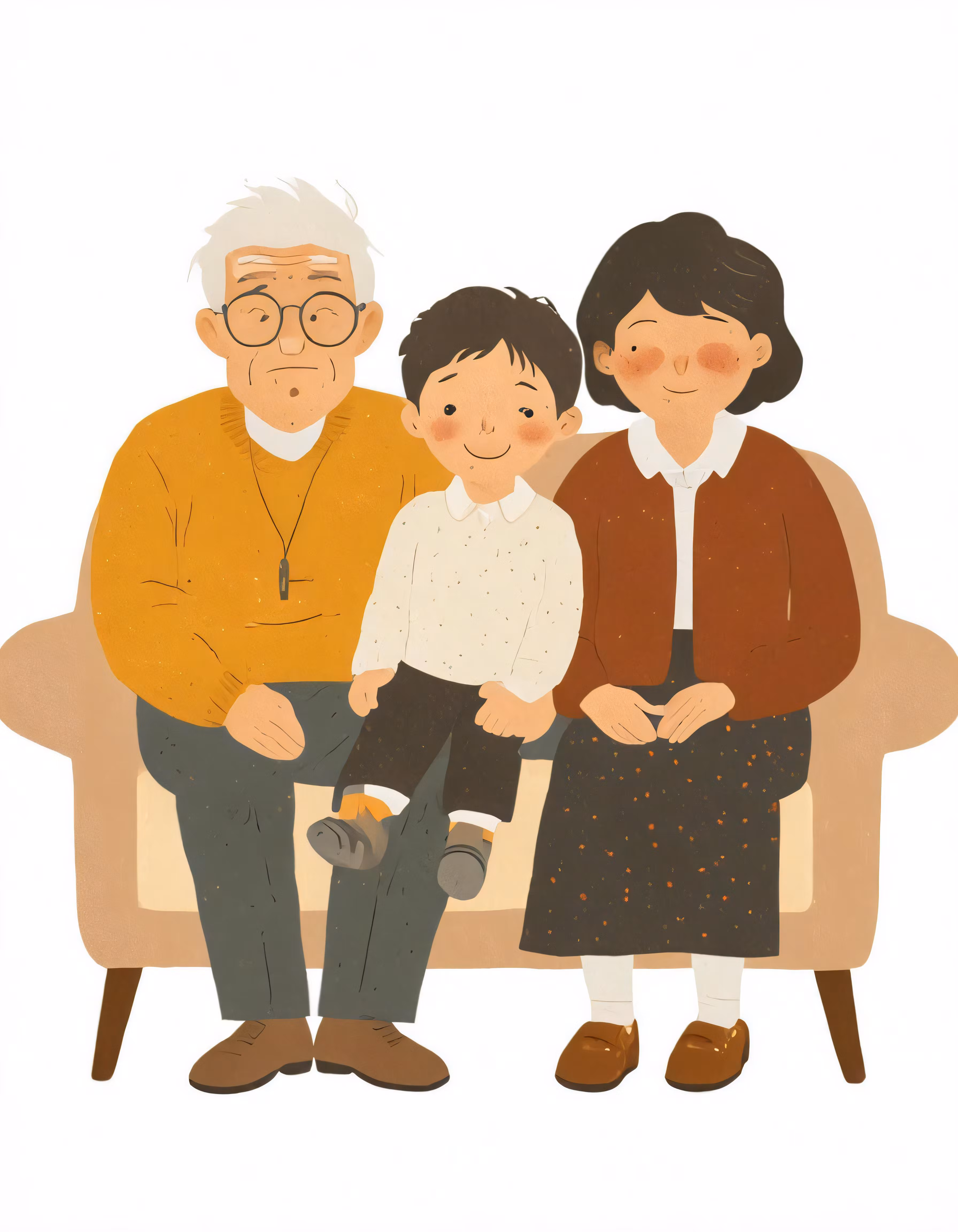 High resolution picture, free to use, a family sitting on a couch with an elderly man and woman
