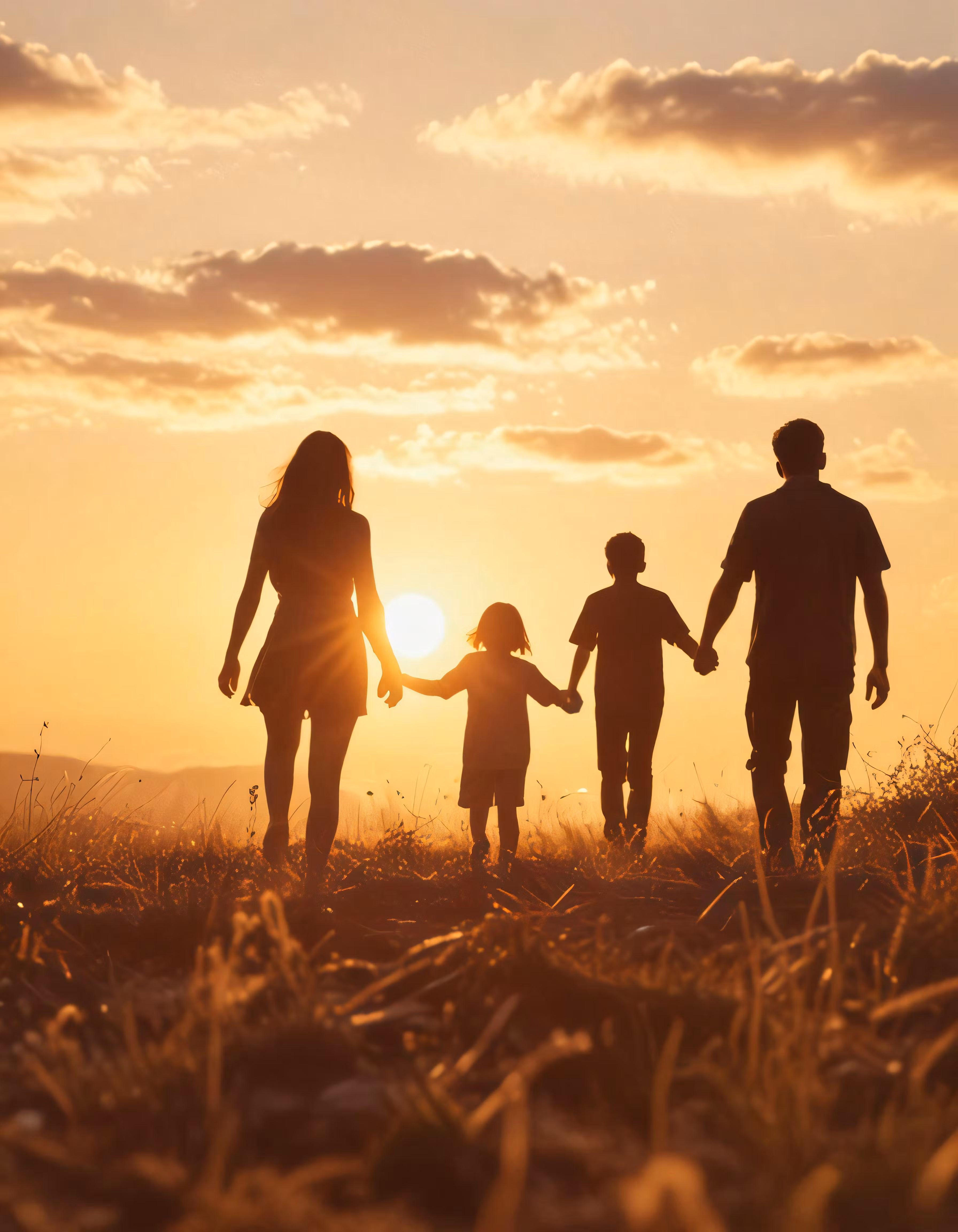 High resolution picture, free to use, a family walking in the field while the sun is setting