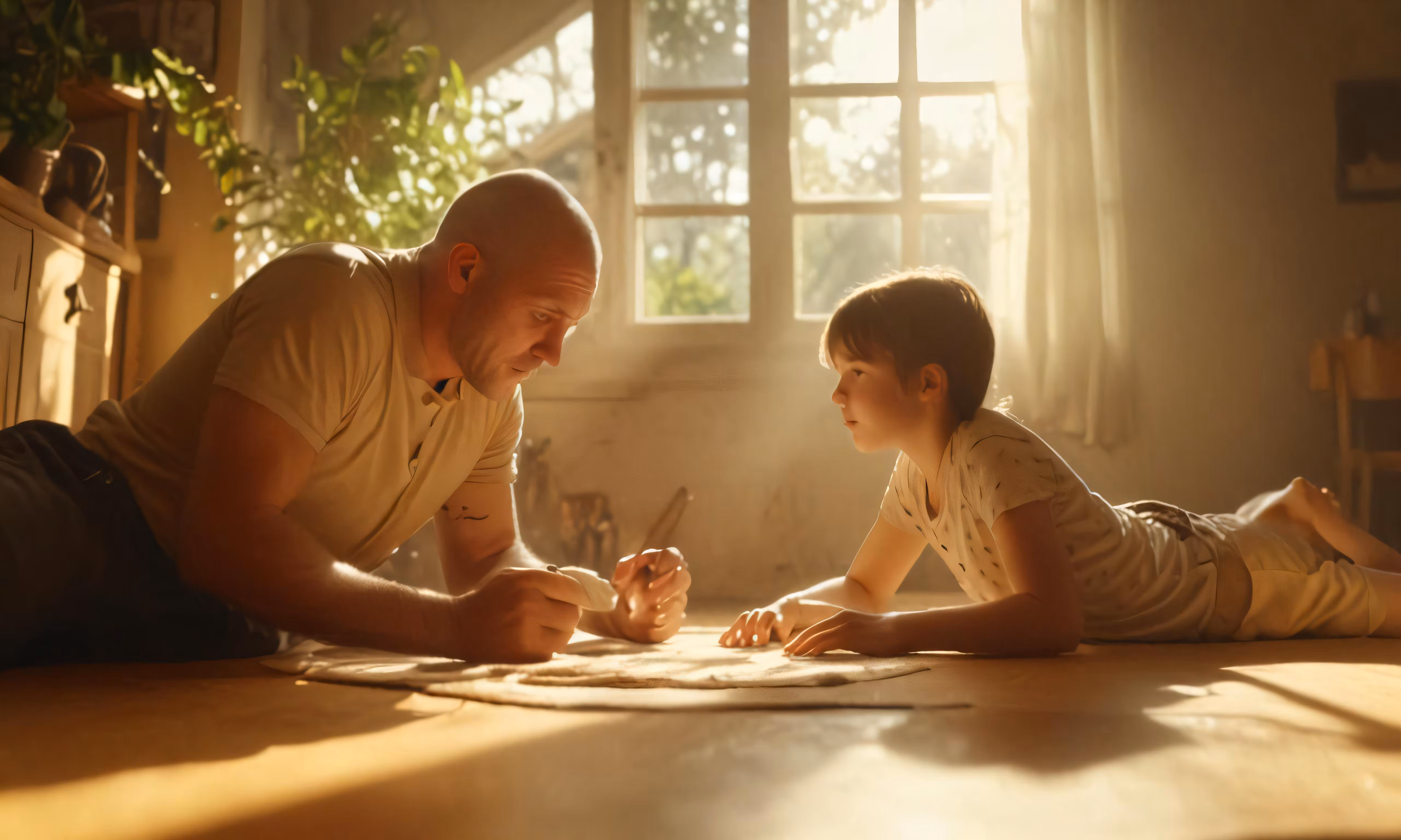 High resolution picture, free to use, a father and daughter are lying on the floor