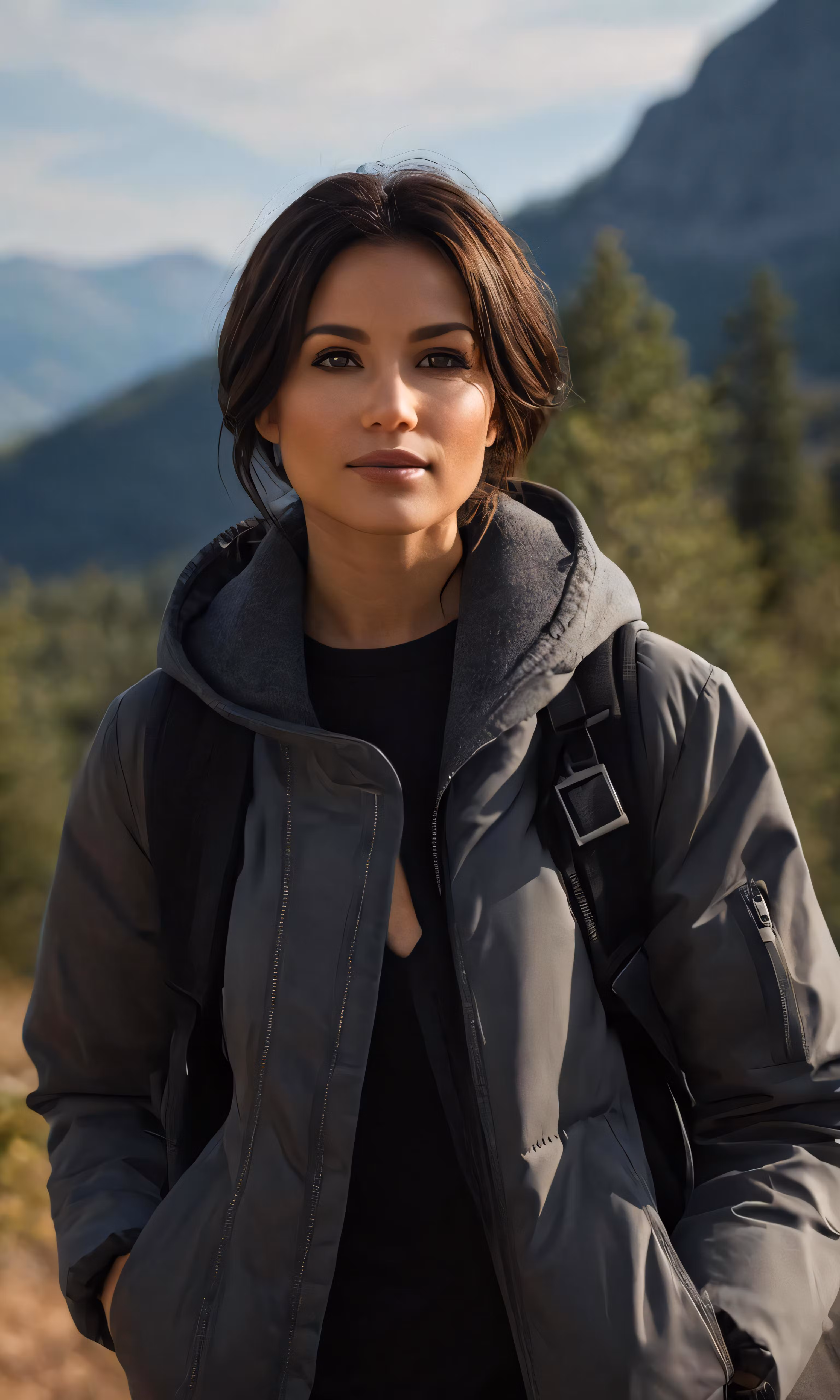 High resolution picture, free to use, a female in a black top is wearing a gray jacket