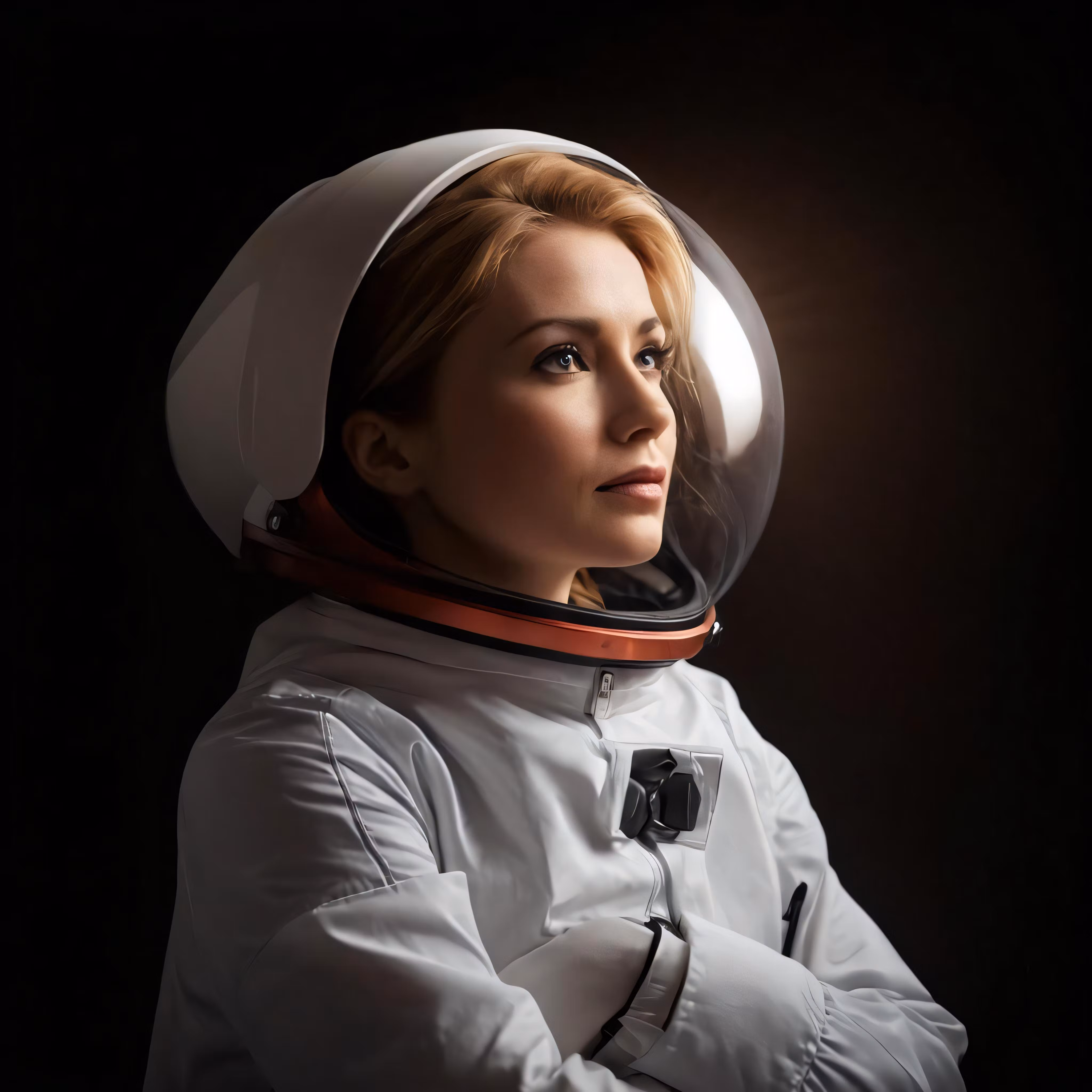 High resolution picture, free to use, a female in a helmet is standing against a black background