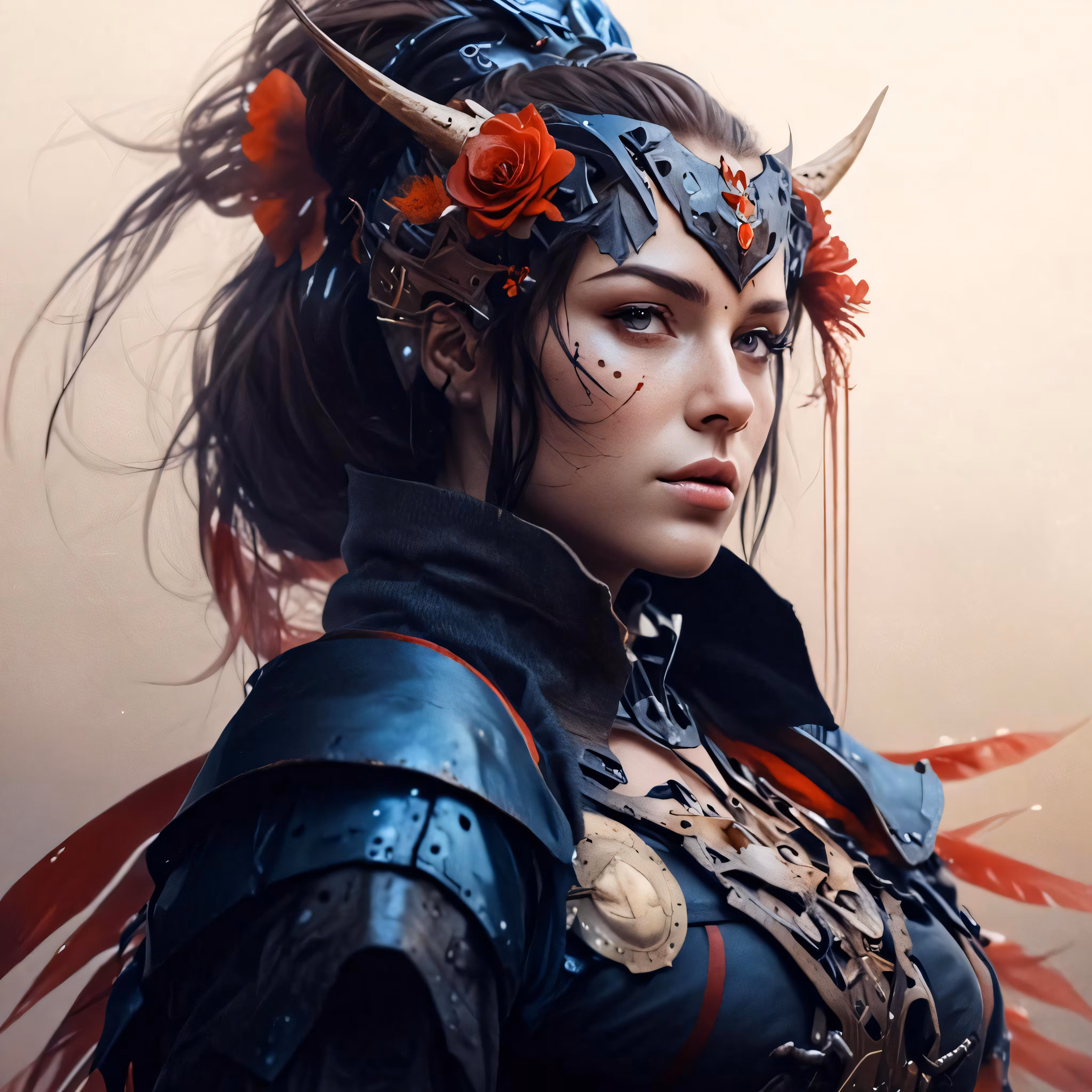 High resolution picture, free to use, a female knight character dressed in black and red clothing