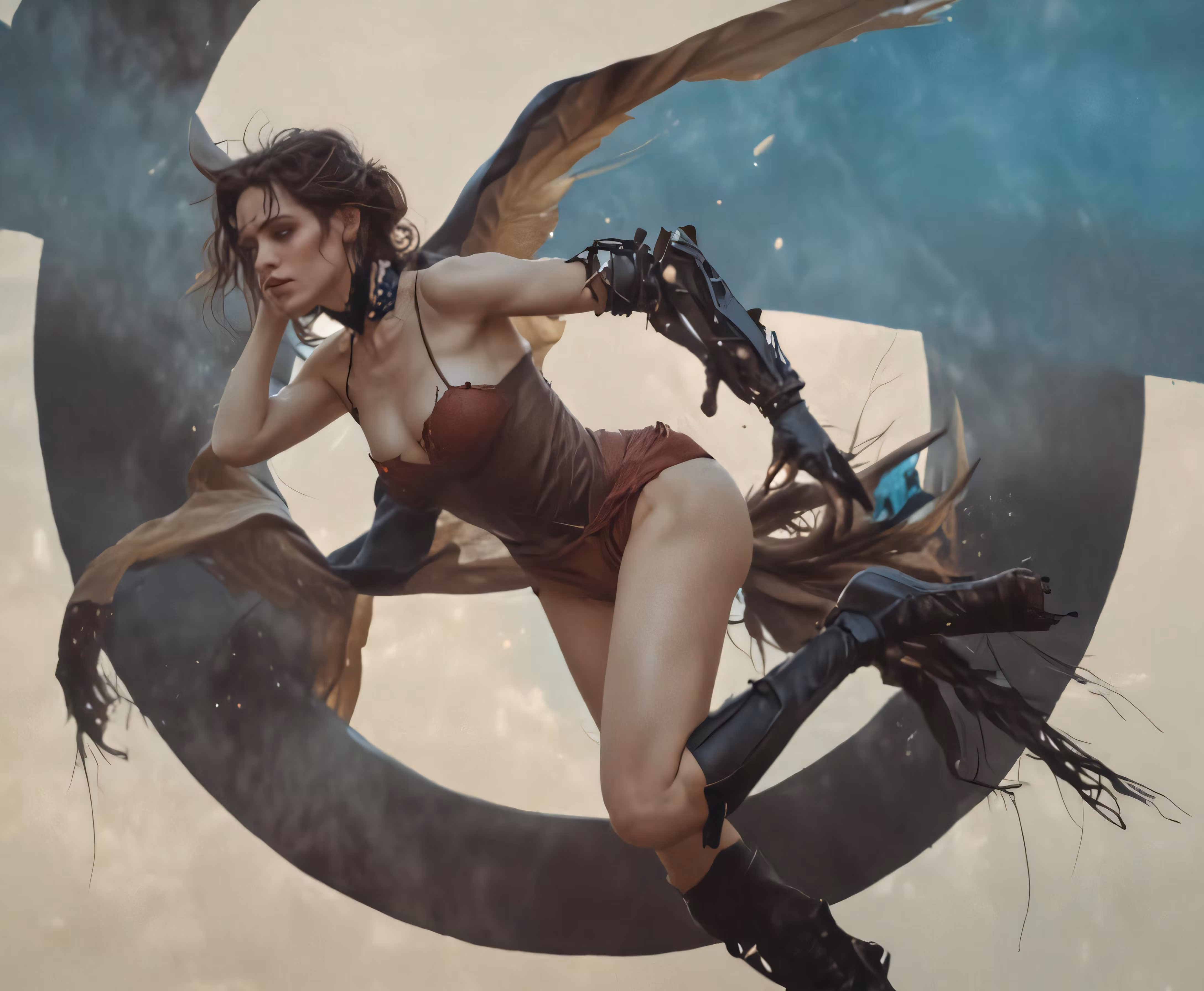High resolution picture, free to use, a female robot warrior wearing a bikini with wings on the back of her head