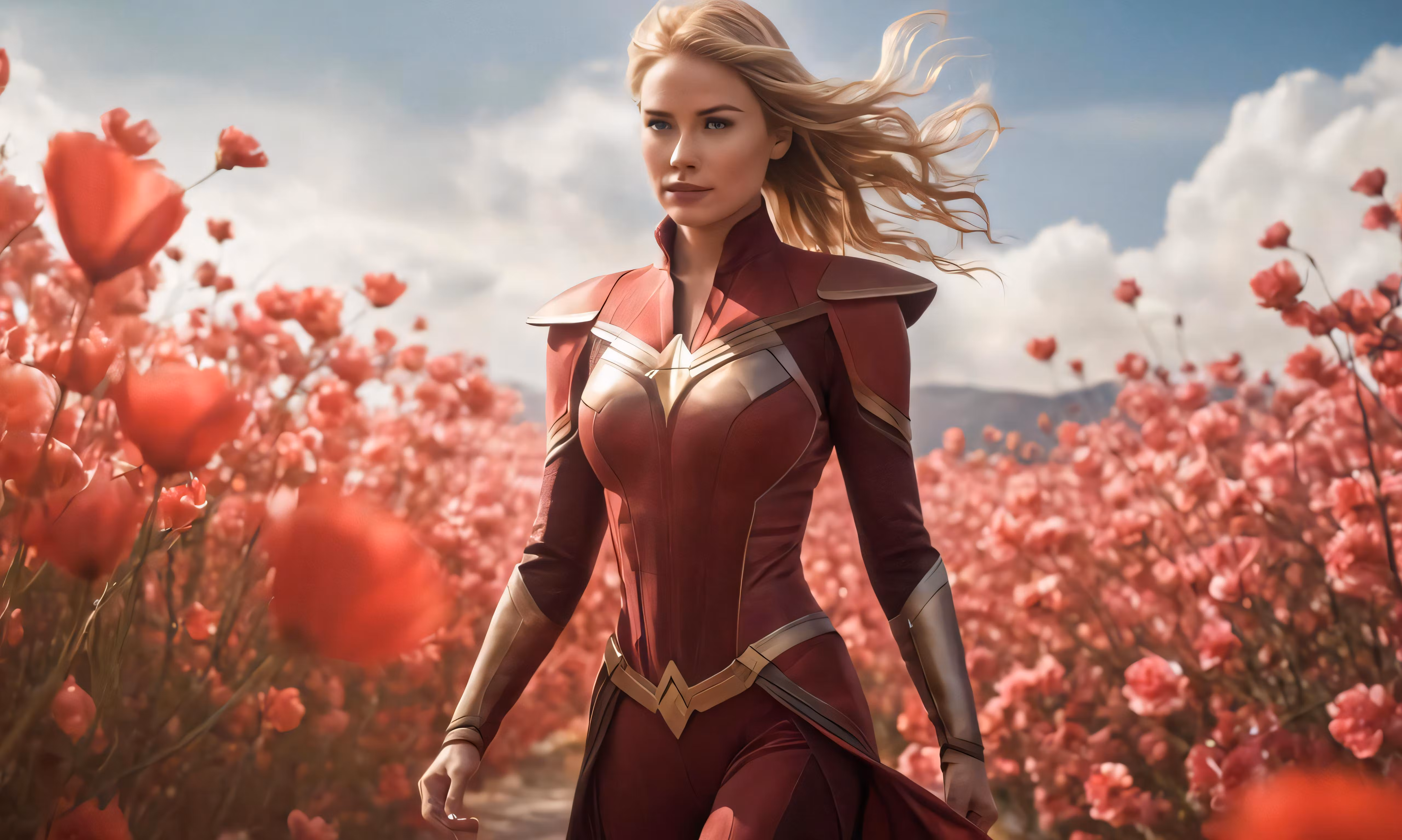 High resolution picture, free to use, a female thor   man walks through a field full of red flowers