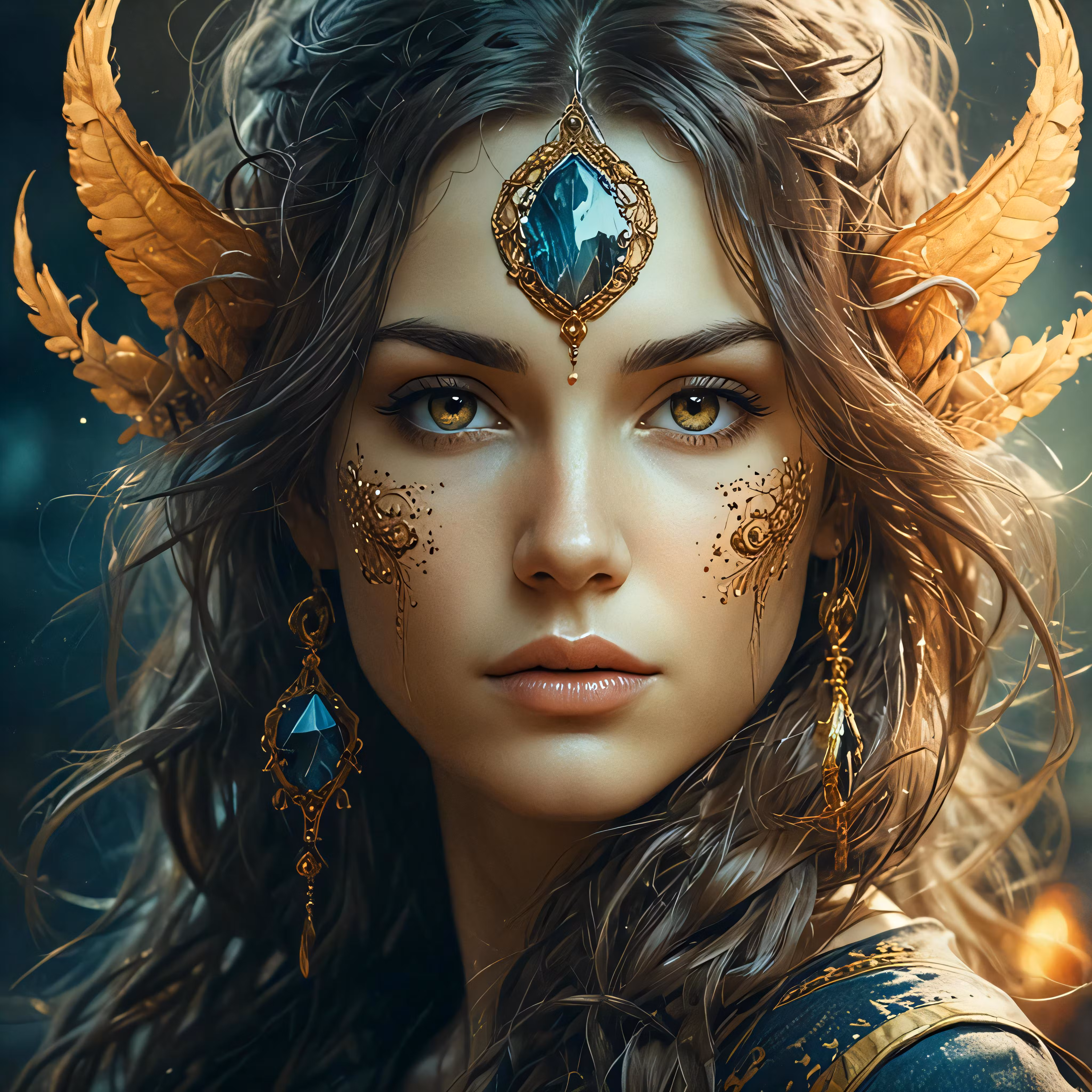 High resolution picture, free to use, a female with a long, flowing hair and gold jewelry is staring into the camera