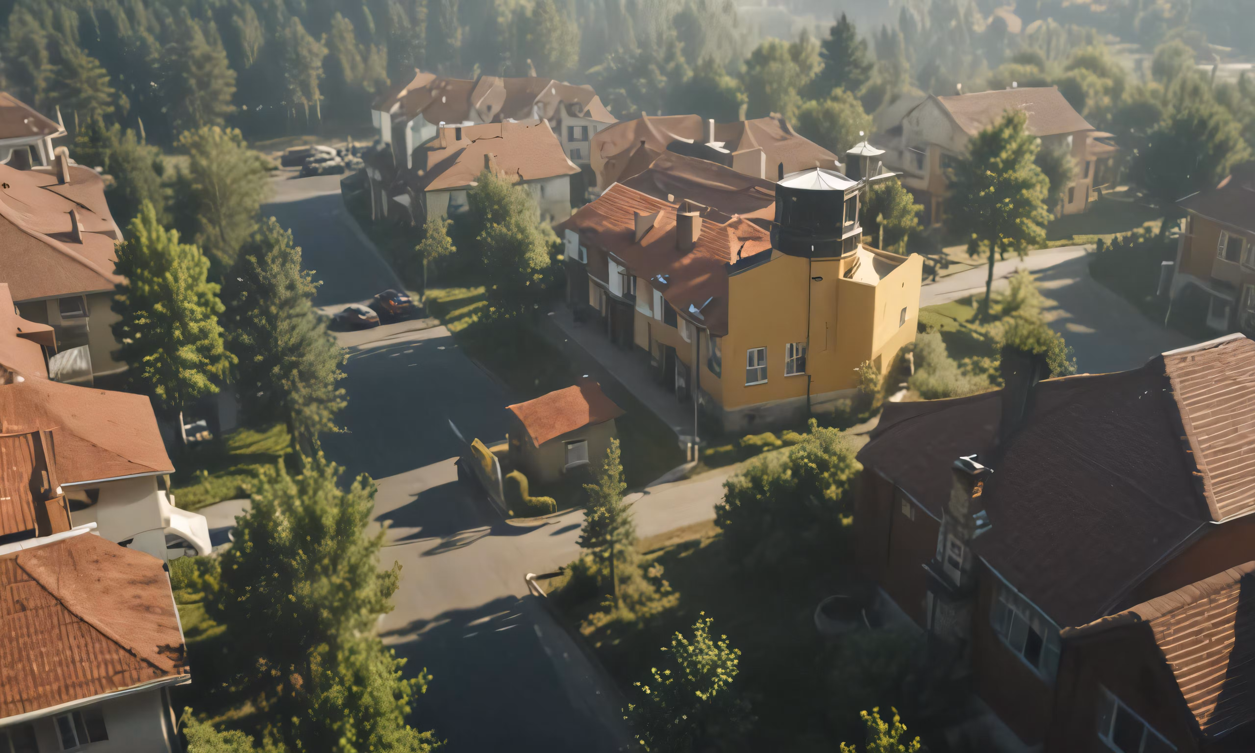High resolution picture, free to use, a few small buildings sit by the side of a road