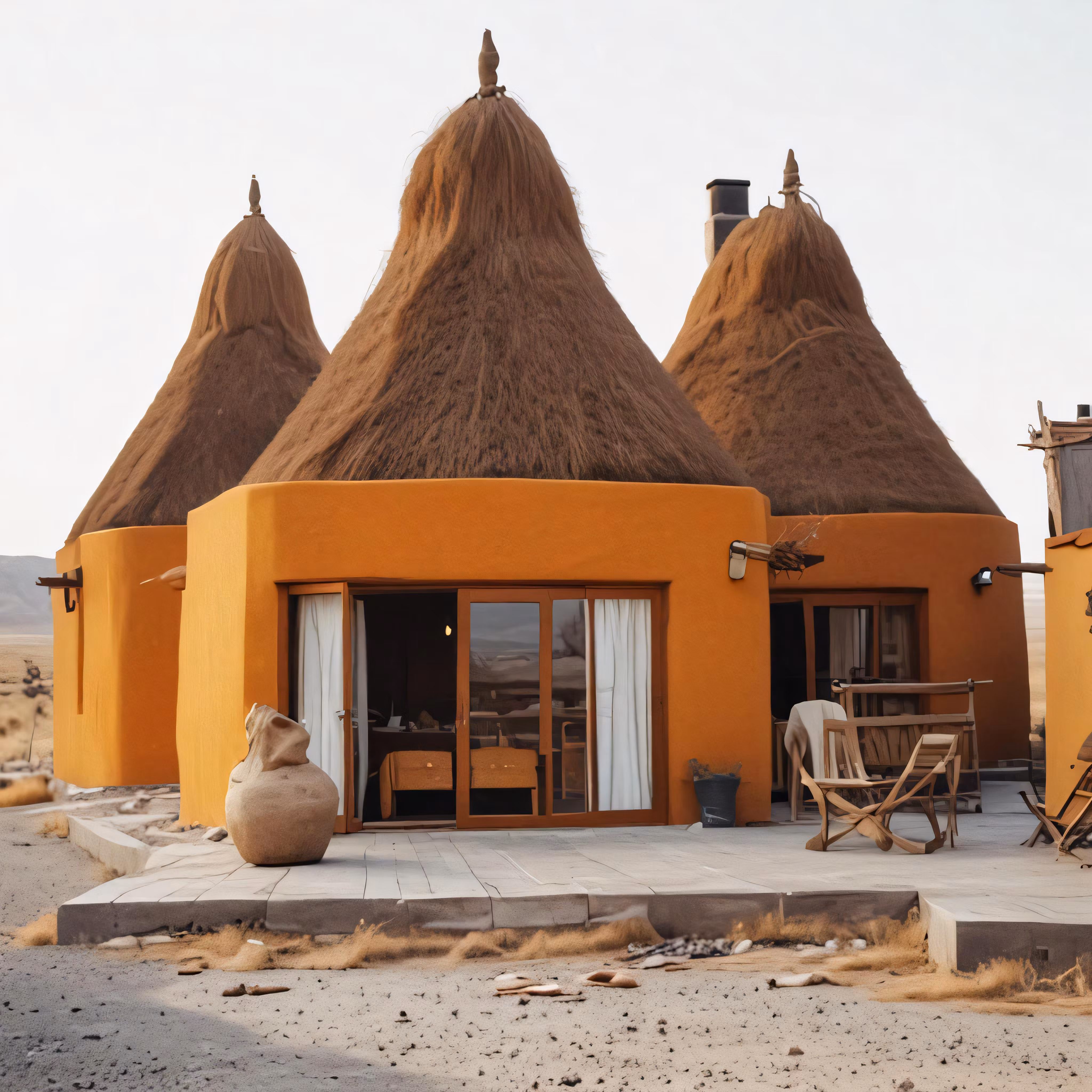 High resolution picture, free to use, a few thatched roofed homes on a desert like area