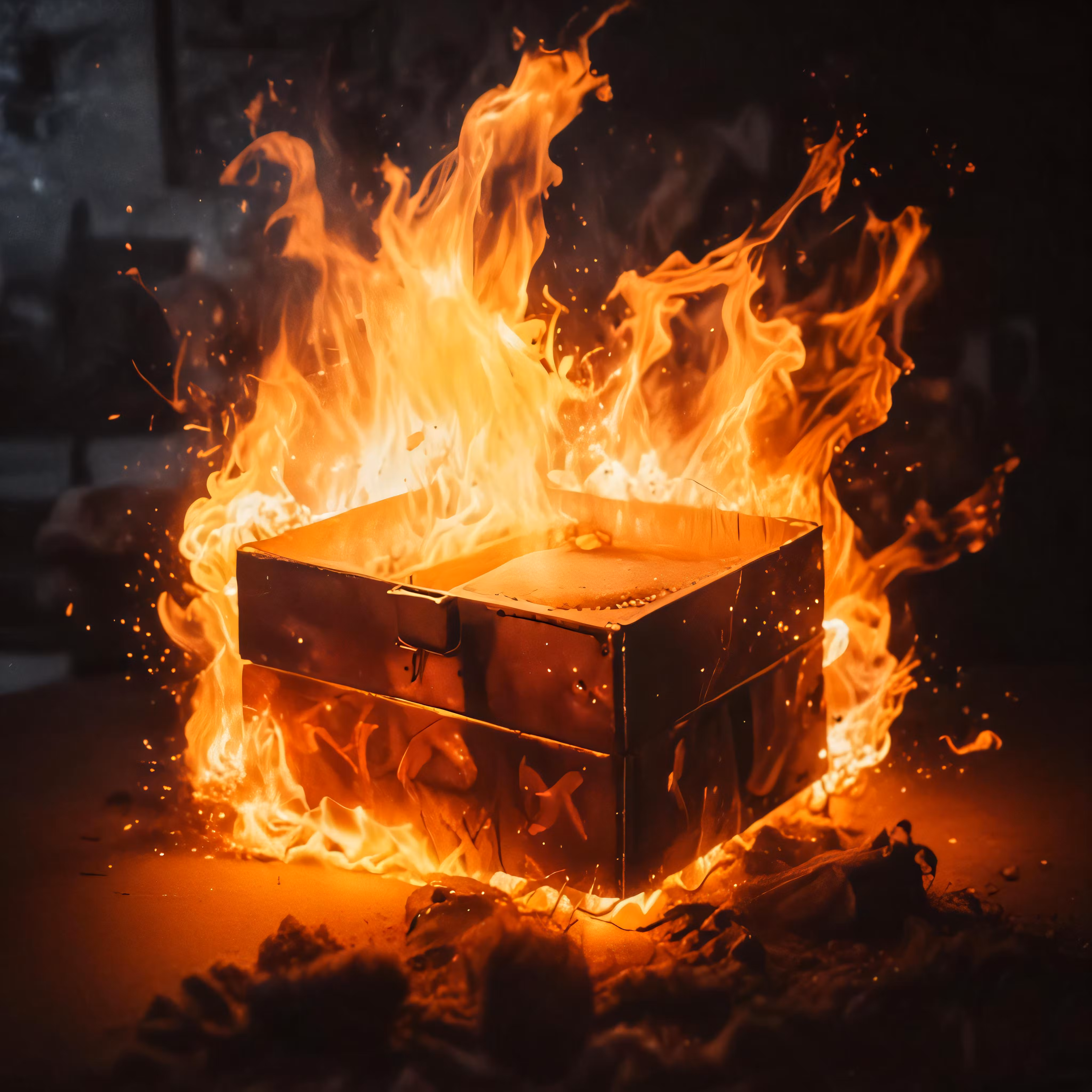 High resolution picture, free to use, a fire filled crate on top of a pile of rocks