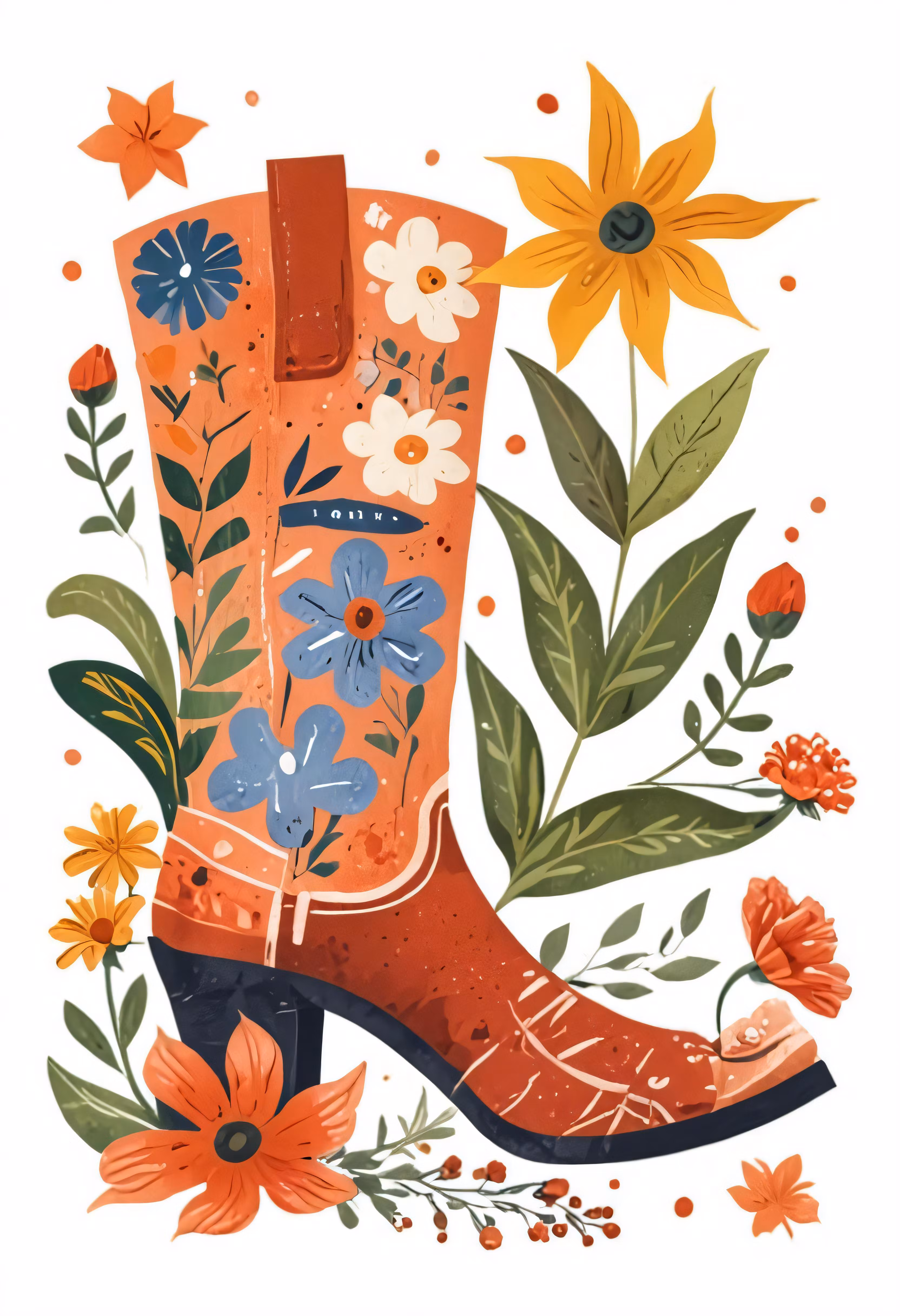 High resolution picture, free to use, a flower print of an orange boot and a bouquet of flowers