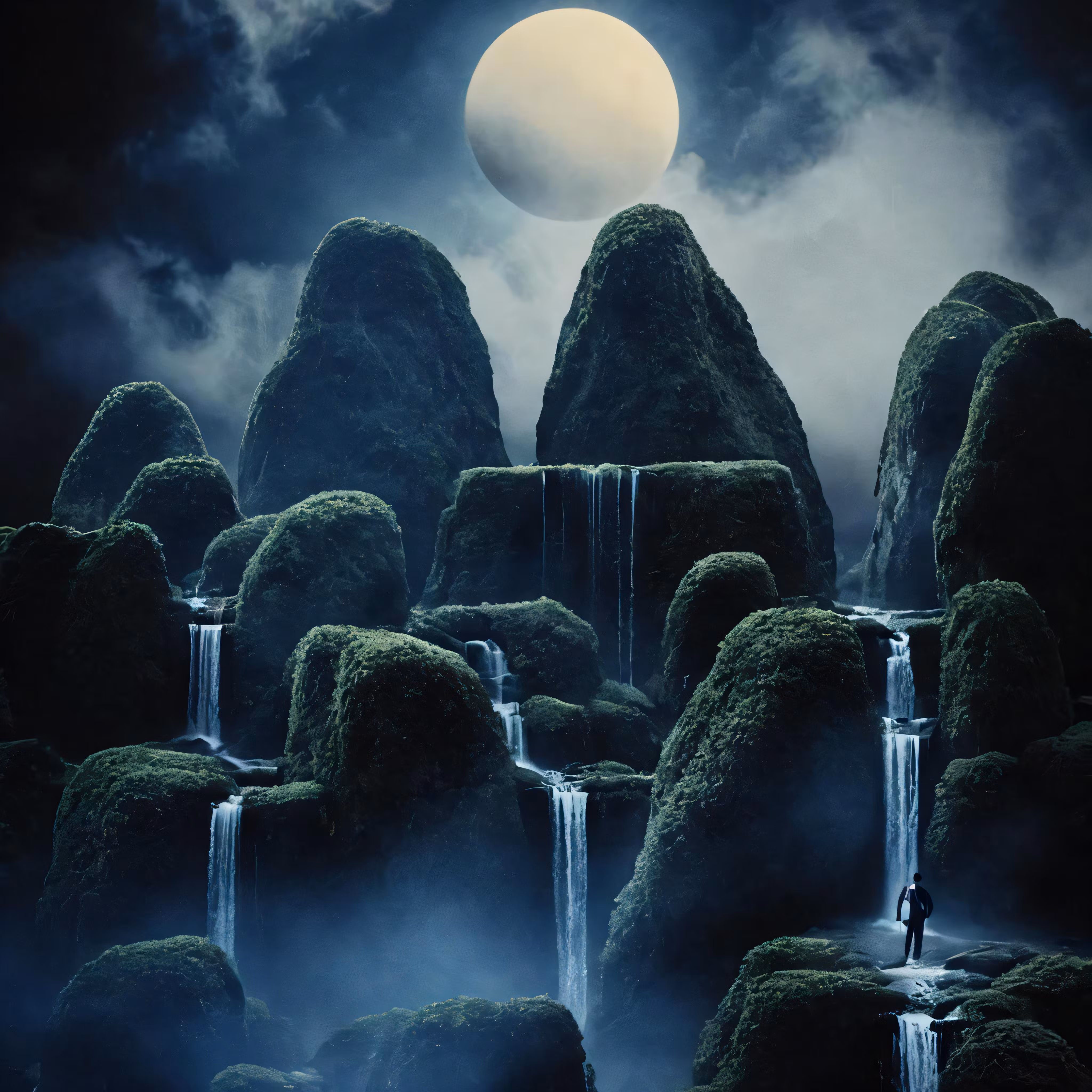 High resolution picture, free to use, a foggy landscape with a full moon and trees in the background
