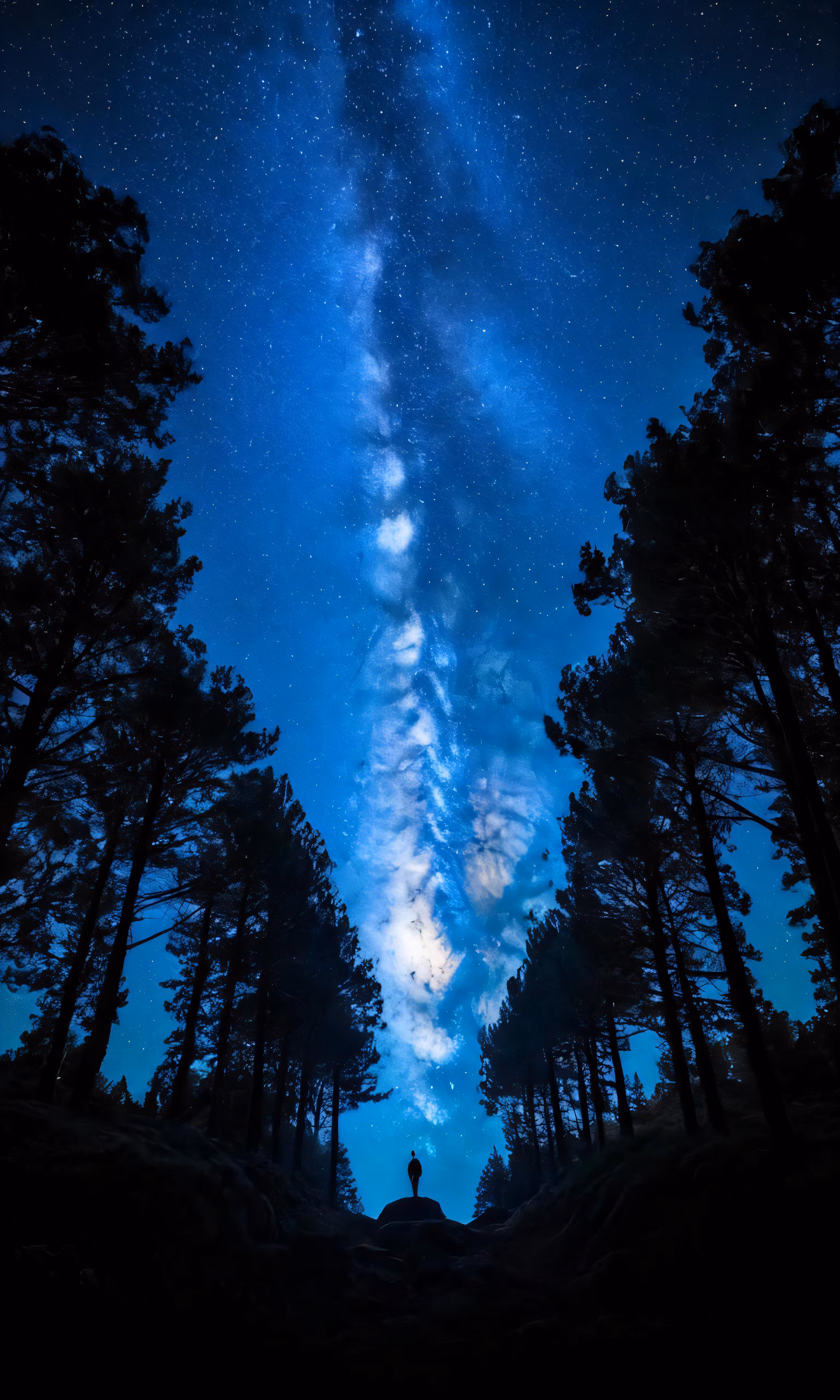 High resolution picture, free to use, a forest filled with tall evergreen trees under a sky full of stars