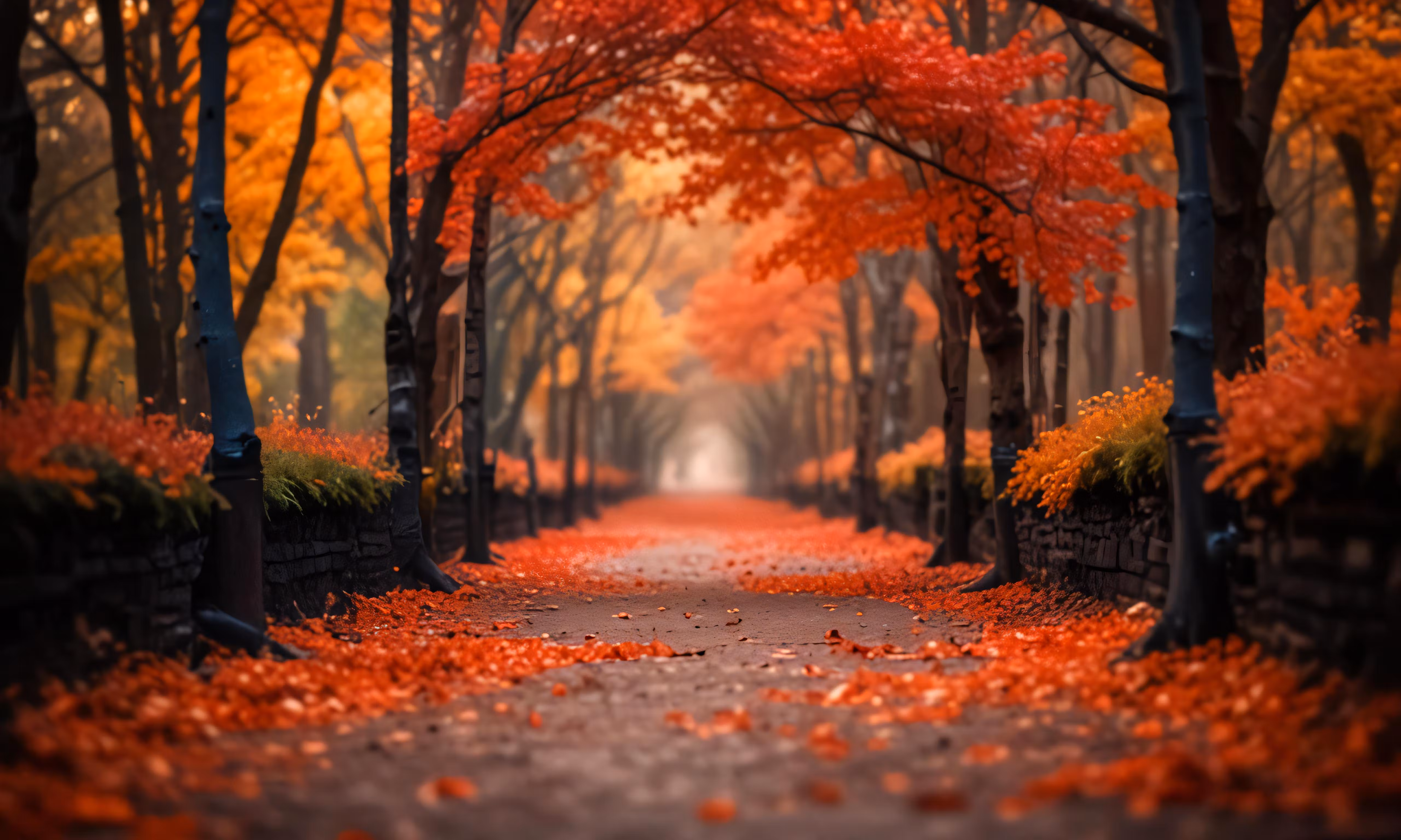 High resolution picture, free to use, a forest path in autumn with orange leaves on the trees