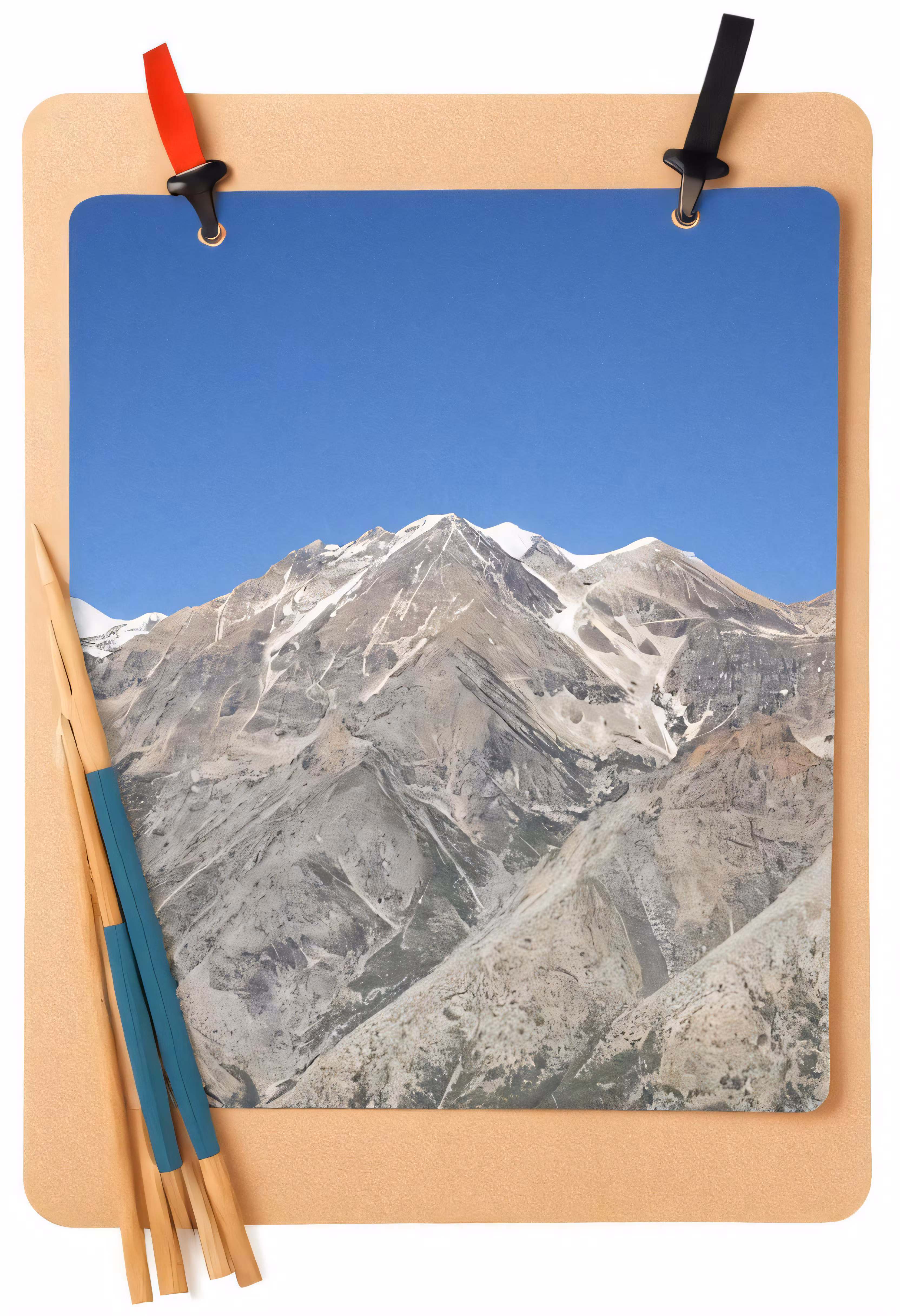 High resolution picture, free to use, a frame with a mountainside photo with pencils