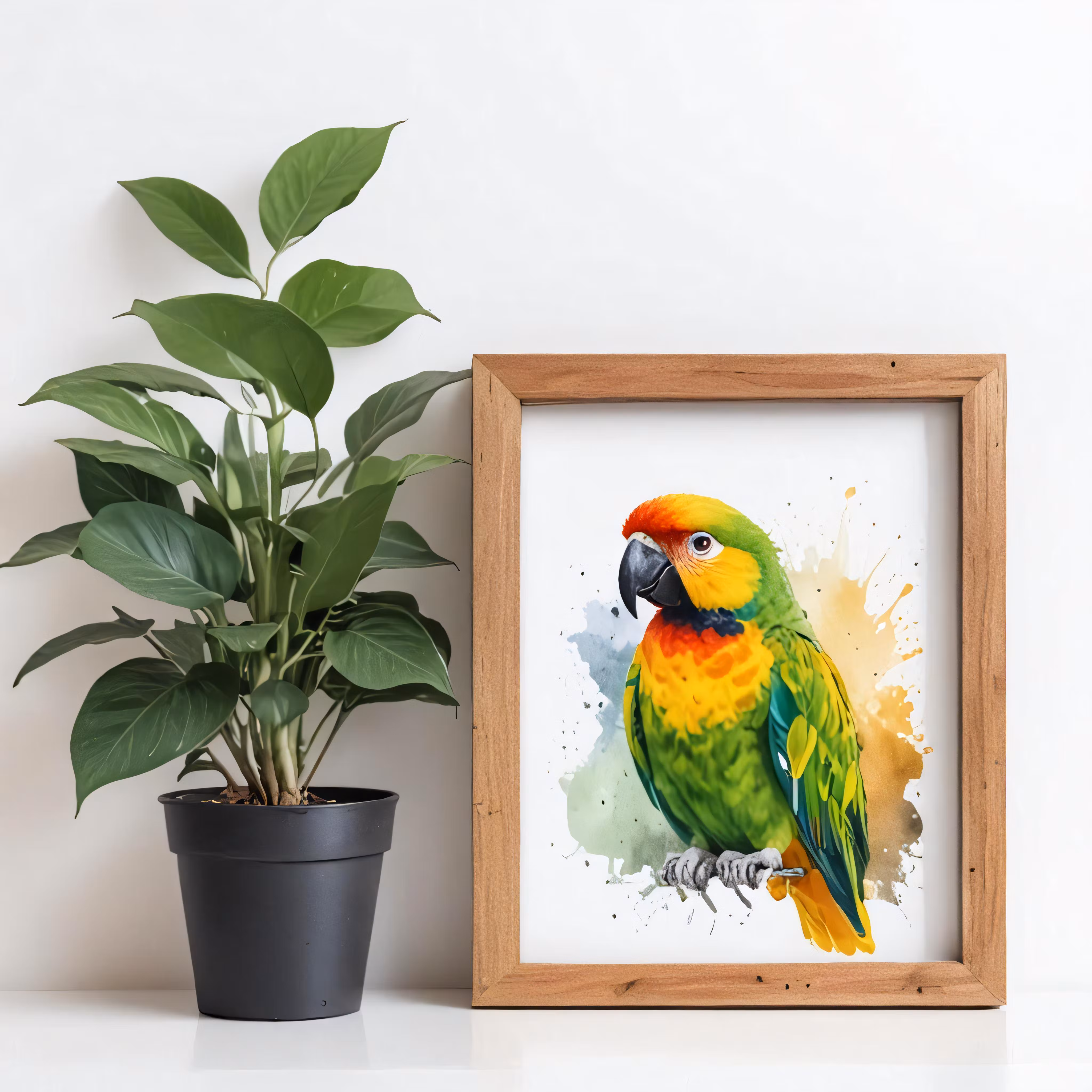 High resolution picture, free to use, a framed photo of a colorful parrot sitting next to a plant