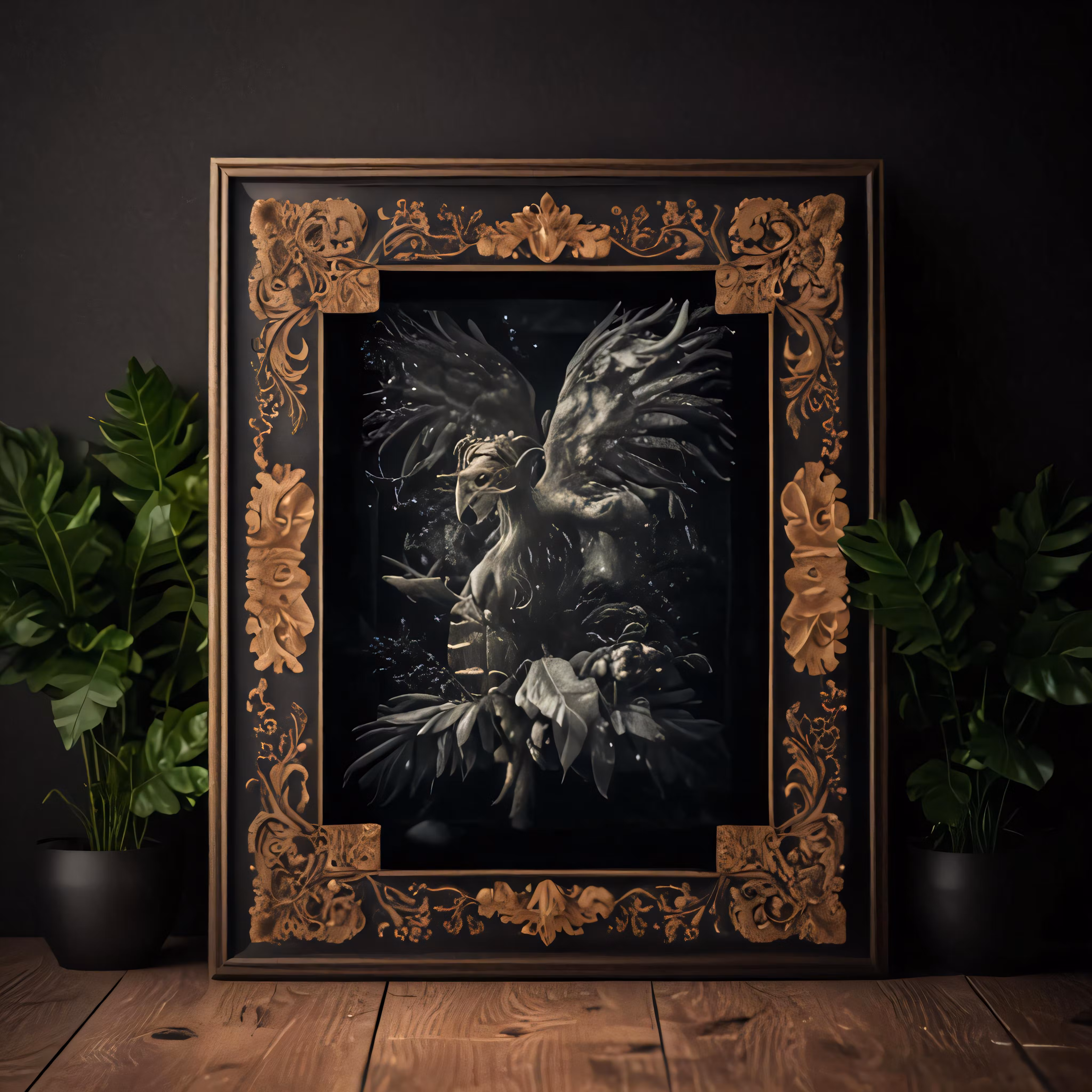 High resolution picture, free to use, a framed photograph of a mythical creature with wings and a flower decoration