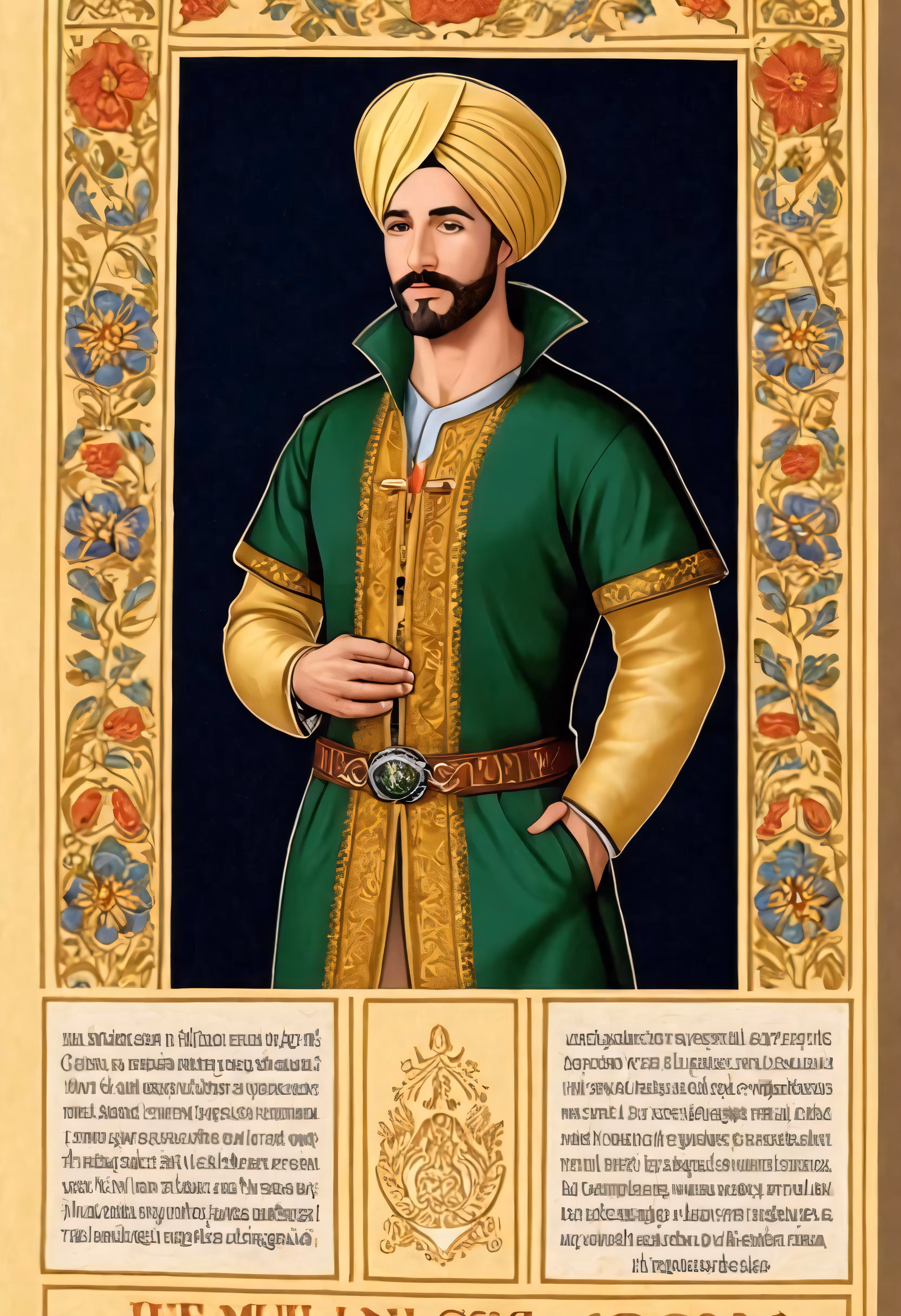 High resolution picture, free to use, a framed portrait of a man in green and yellow