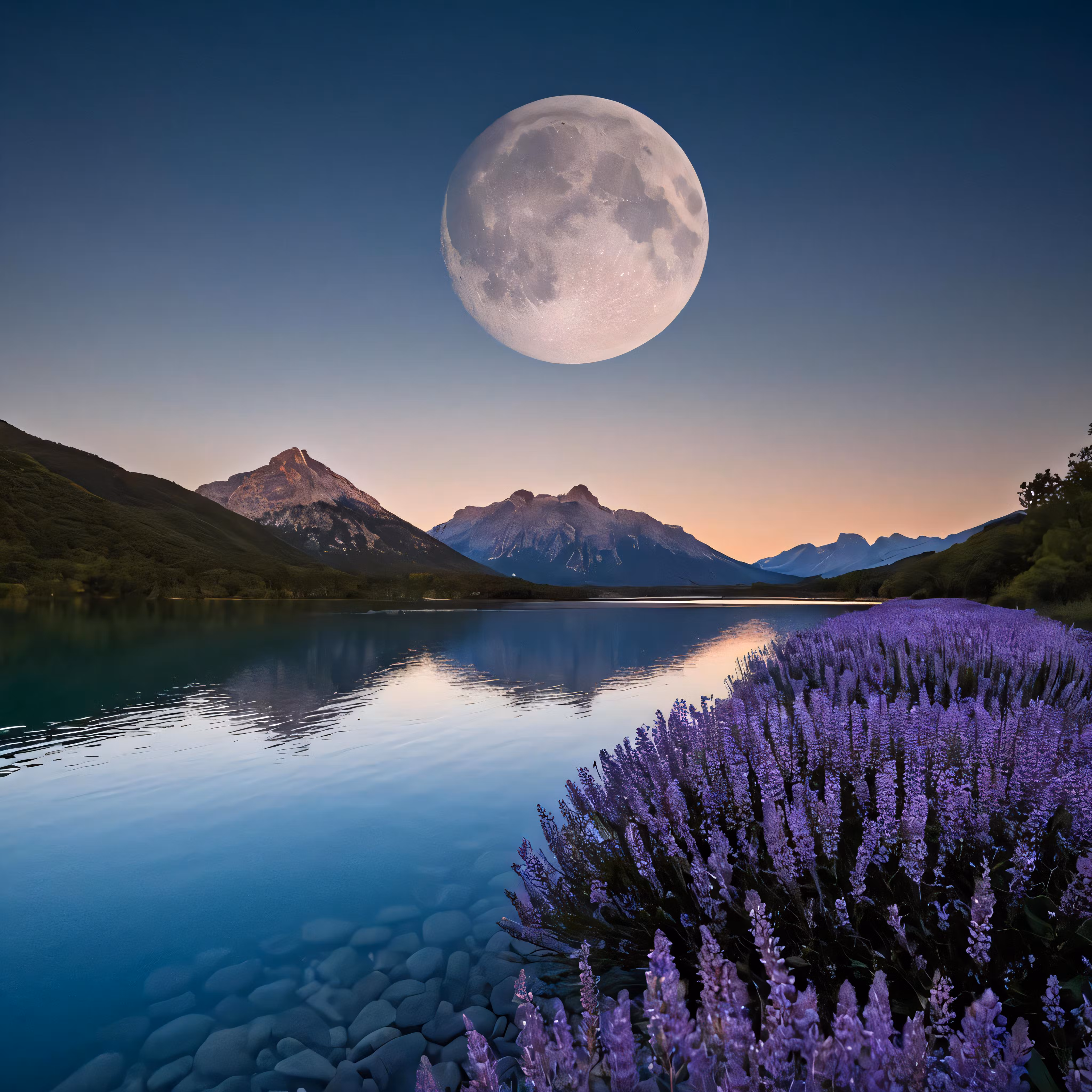 High resolution picture, free to use, a full moon sets over a mountain and lake