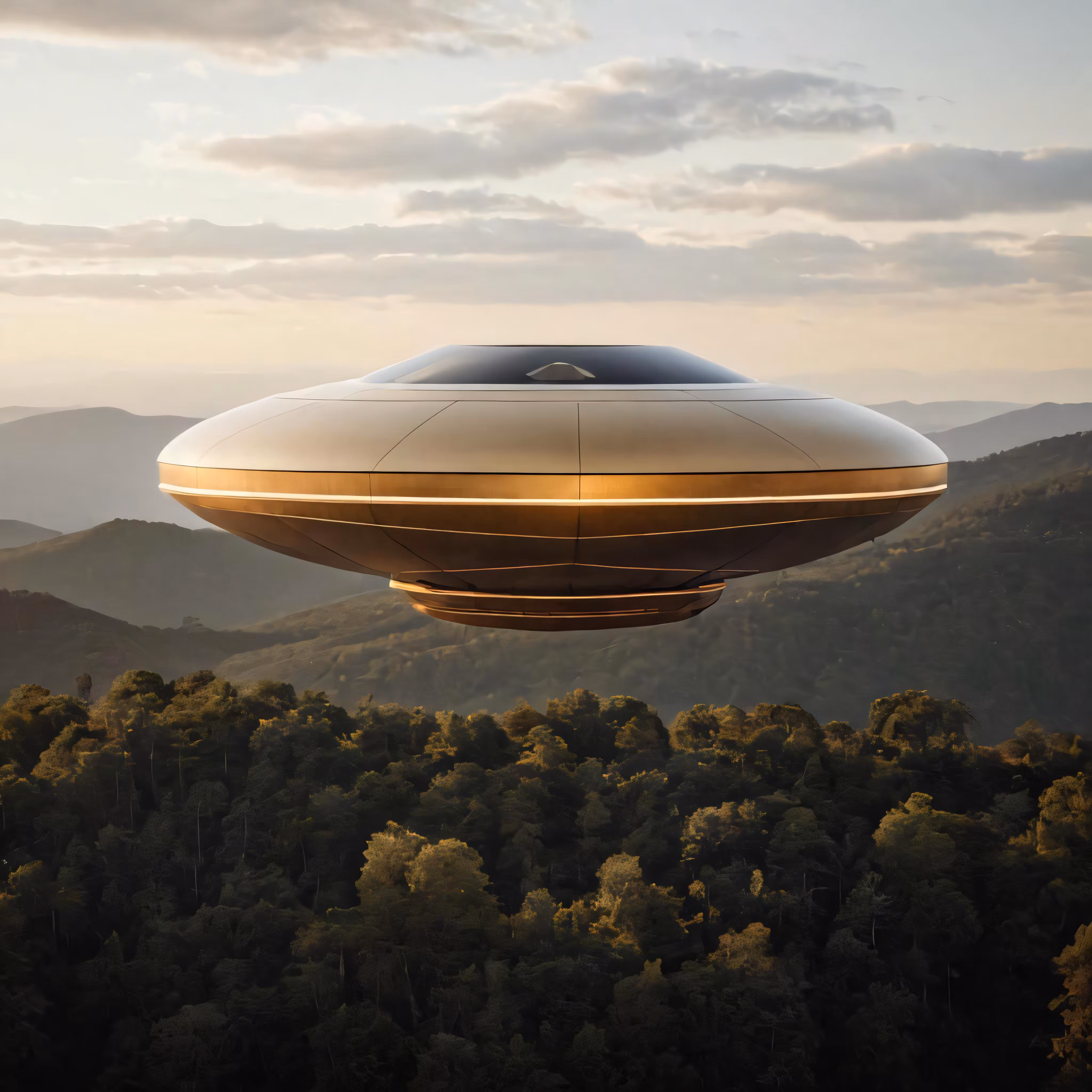High resolution picture, free to use, a futuristic flying vehicle in the middle of a landscape