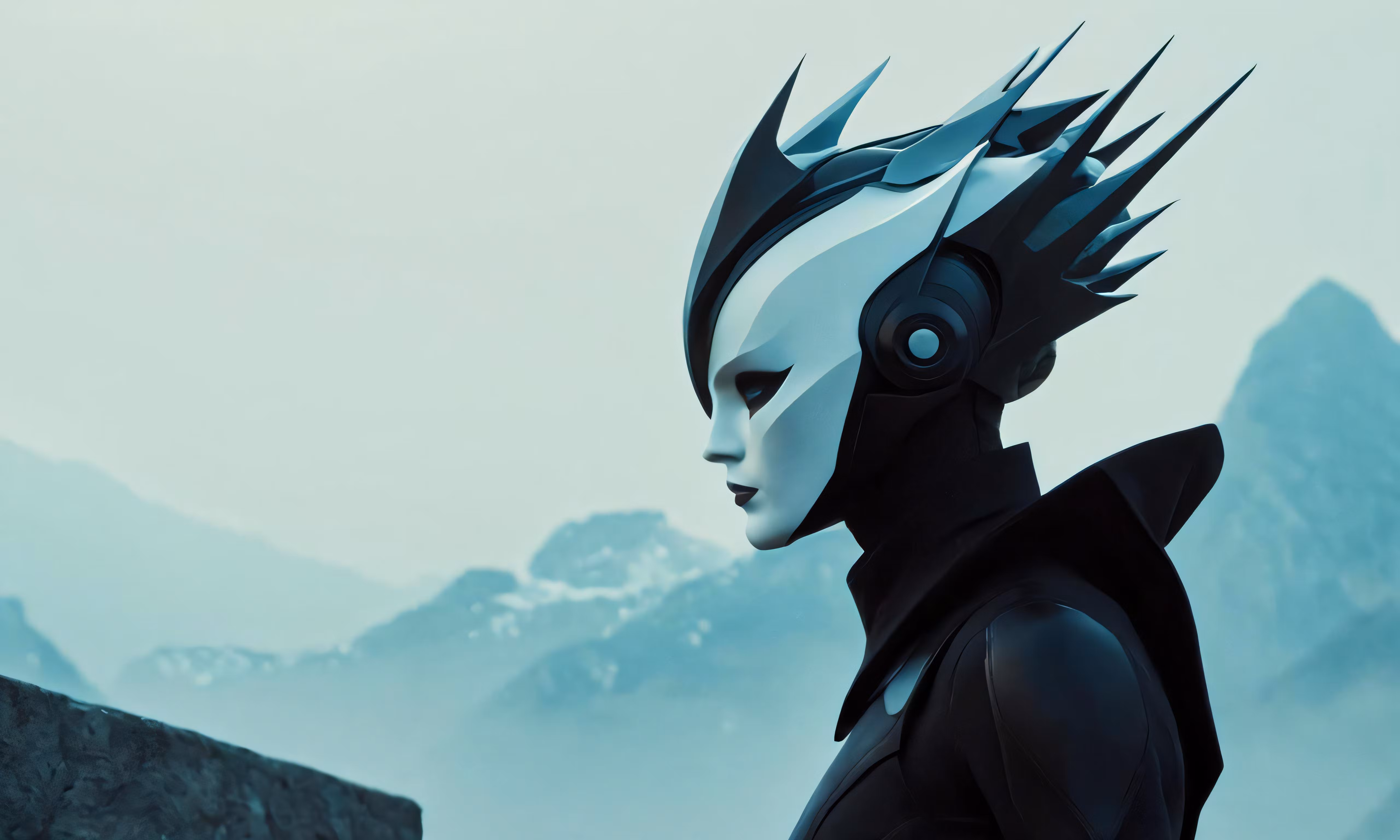 High resolution picture, free to use, a futuristic man wearing headphones stands near a large mountain range